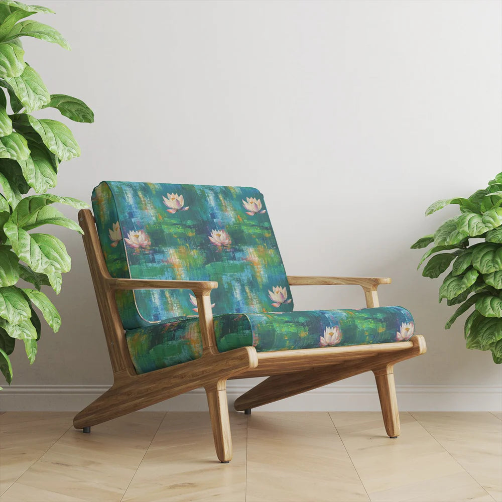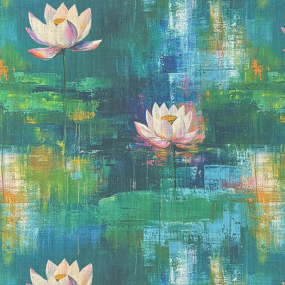 Evoking the tranquil romance of a dreamlike water garden, Expressionism No.3 Upholstery Fabric brings together layers of emerald, teal, and aquamarine brushstrokes with upright lotus stems blooming across the surface. Painterly yet composed, this fabric transforms any interior into a contemplative, expressive space.