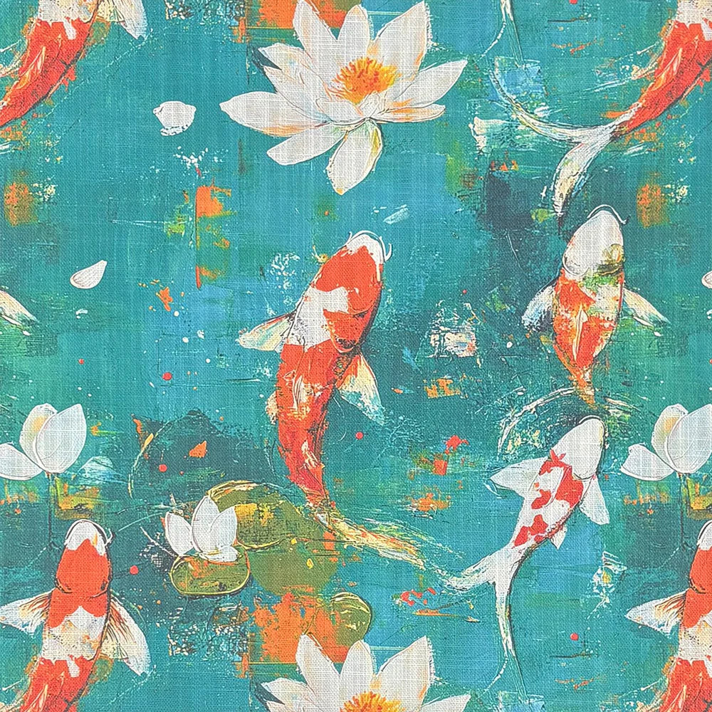 Capture the poetic energy of a tranquil koi pond with Expressionism No.7 Upholstery Fabric, a vivid and expressive textile drawn from painterly abstraction and meditative motion. Deep teal water provides the backdrop for vivid orange-and-white koi, gliding through brushstrokes of jade, citrus, and ink-black shadows. Soft white lotus blossoms add serenity, drifting among the whirlpools with graceful rhythm.