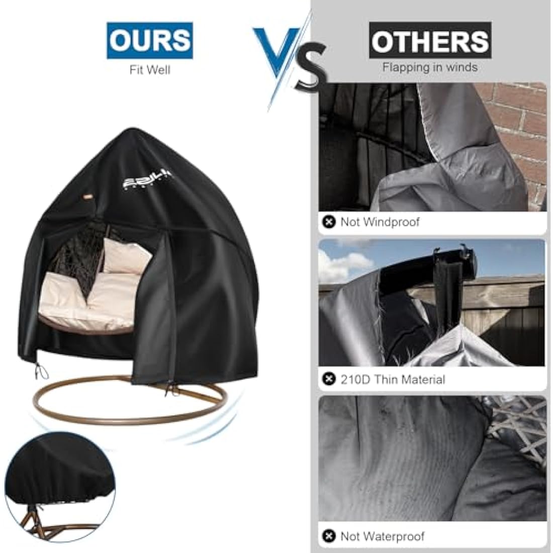 UPGRADED THICKER 420D OXFORD MATERIAL: Ezilif double Egg chair cover is made of 420D heavy duty Oxford material with PU coating, durable and thicker, anti-tear, better waterproof, anti-scratch; The seams are made of double stitching, which can effectively protect your outdoor hanging egg chair against heavy rains, winds and snow, dust, strong UV, or other bad weathers etc, also protects your garden swing egg chair from any dust scratches, marks, or getting rusty etc, makes your outdoor chair look like new