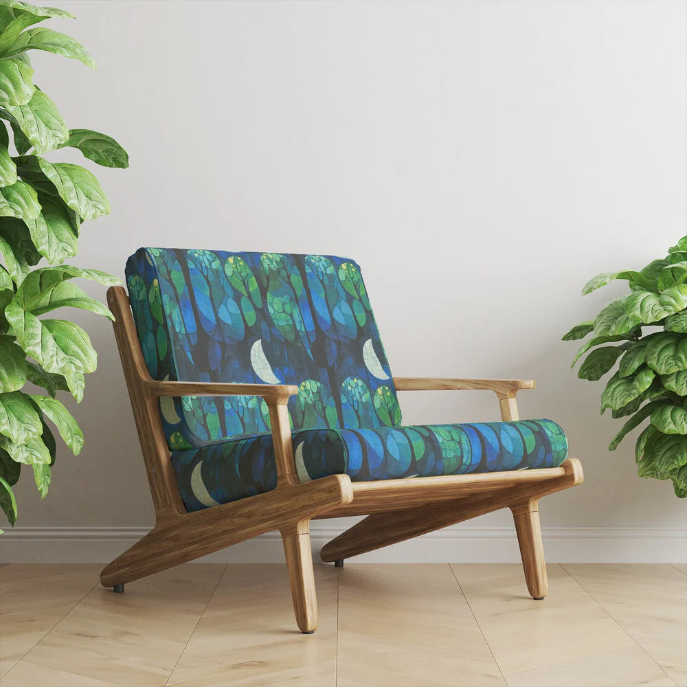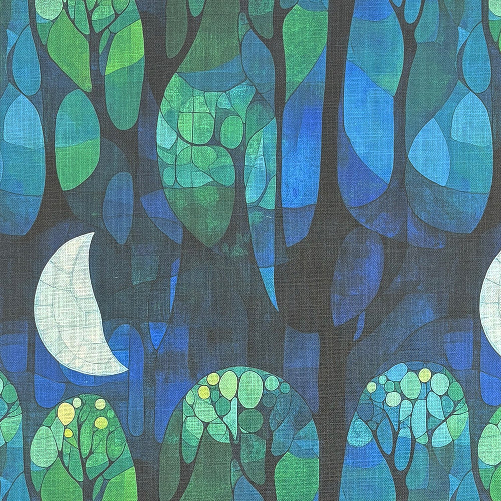 Step into an enchanted forest with Figueres No.15 – a deep, dreamlike upholstery fabric drawn from the world of expressionist art. This atmospheric design weaves together rich midnight blues, shadowed greens, and cool turquoise to create an abstract woodland alive with mystery and movement. A crescent moon floats quietly among layered foliage, evoking the surreal beauty of a moonlit night.