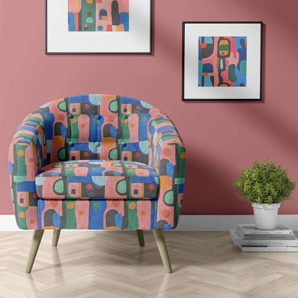 Fresco No.16 is a joyful celebration of colour and contrast—an abstract upholstery fabric bursting with vibrant shapes and painterly blocks. Against a soft blush-pink backdrop, pops of cobalt, mint, tangerine, scarlet, and forest green come together in a rhythmic dance of organic and geometric forms. With a nod to mid-century modern aesthetics, this fabric’s layered composition evokes the bold, playful energy of abstract art, perfectly suited to contemporary interiors seeking personality and flair.