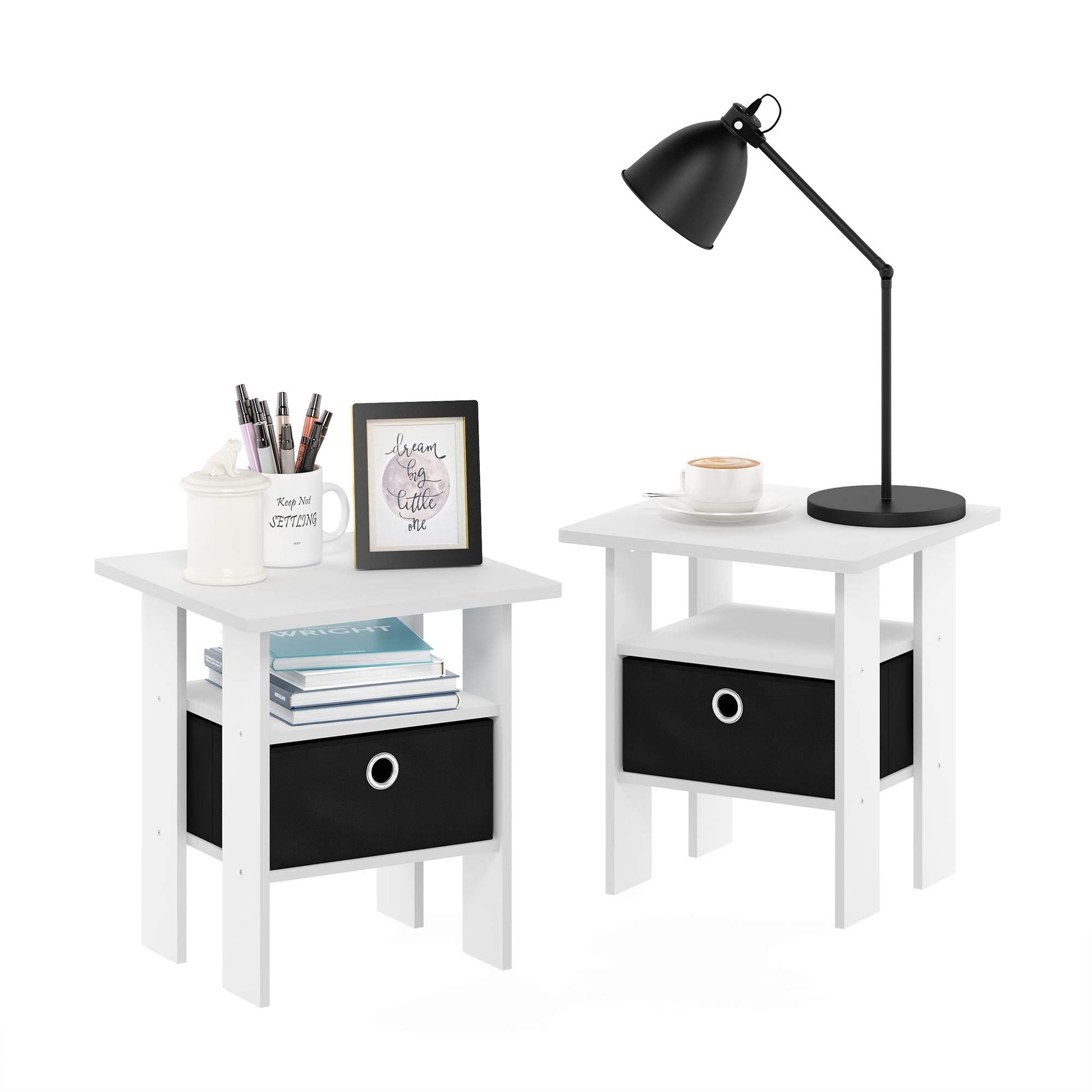 Furinno ANDREY Side Table, Set of 2 End Table, Night Stand with Open Shelves and Storage Bin, Bedside Table, for Living Room, Bedroom, White