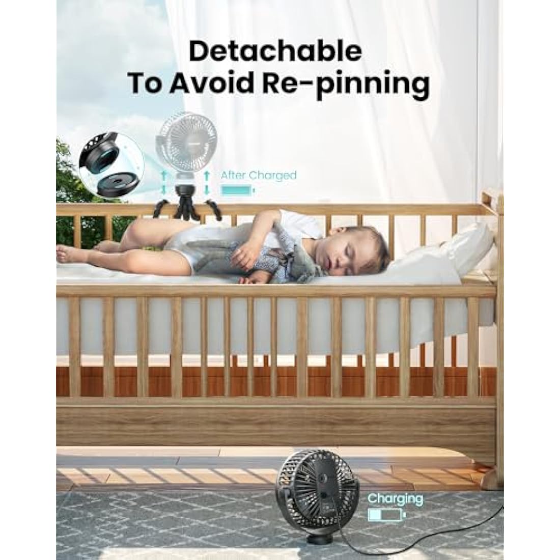 Upgraded Flexible Durable Tripod - Material: We used food-grade silicone, so you don't have to worry about the baby eating it by mistake. Tripod: Optimized the tripod fixing method, which is more durable and not easy to fall off. Structure: You can remove the fan head to charge at will, no need to remove it from the original fixed place