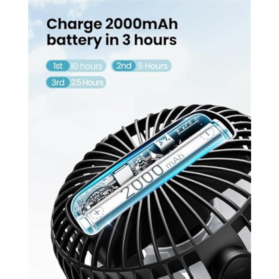 USB or Rechargeable Battery Operated - The baby stroller fan has a 2000 mAh battery that can last from 3.5 to 10 hours(Depending on speeds). The portable fan can be used while charging. It is convenient for bedrooms, desktops, strollers, camping, car seat, crib, and travel. (The mini fan is only 5.61x2.51x6.49inches, 0.52lb