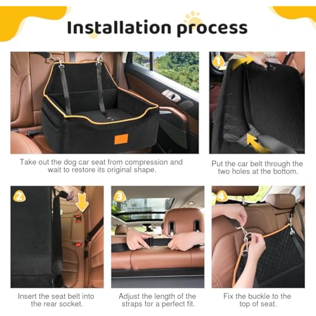 Easy Installation: Installing the dog booster seat is a breeze. Insert the car belt through the two holes at the bottom of the puppy car seat. Adjustable buckle to allowing you to easily secure the seat on the rear seat of your car. Simply fix the seat belt on top of the car seat and adjust its length. With two safety buckles, it is a great dog car seat for two small dogs.