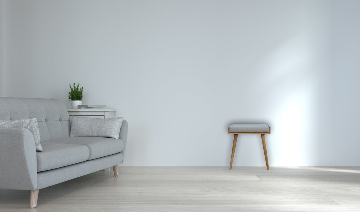 The structure is made primarily from mango wood, a renewable resource. The top is upholstered in grey tweed fabric. Minor variations in wood grain, color, and texture are expected due to the natural materials and handmade process.