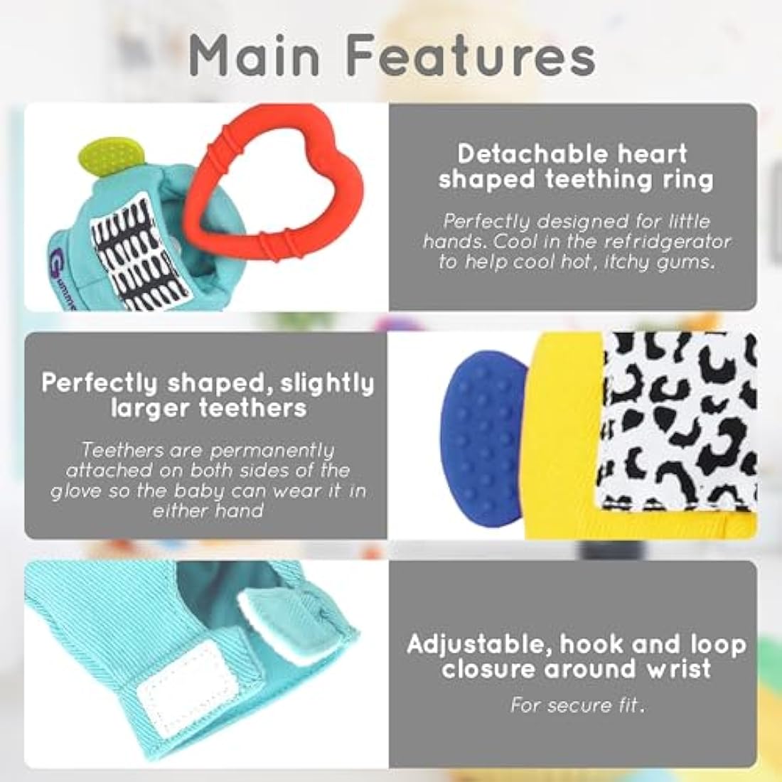 EFFECTIVE TEETHING RELIEF - The Gummee Glove is a teething mitten for babies, providing effective pain relief. The teething mitt includes a toy heart ring which soothes a baby's tender gums. This baby teething mitten contains soft and chewable material, helping alleviate discomfort and promotes a soothing teething experience. The Gummee glove 3-6 Months, is perfectly sized and adjustable to provide a secure fit compared to regular teething toys. A great gift for babies!
