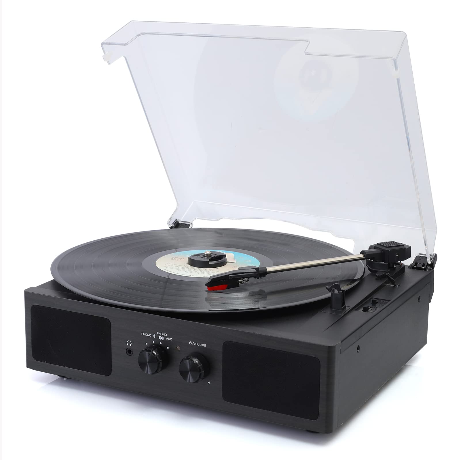 Hernido Vinyl Record Player, Belt-Driven 3-Speed Turntable, Bluetooth Speaker with Input & Output Function, Supports AUX-in, RCA Output, Headphone Jack (Black)