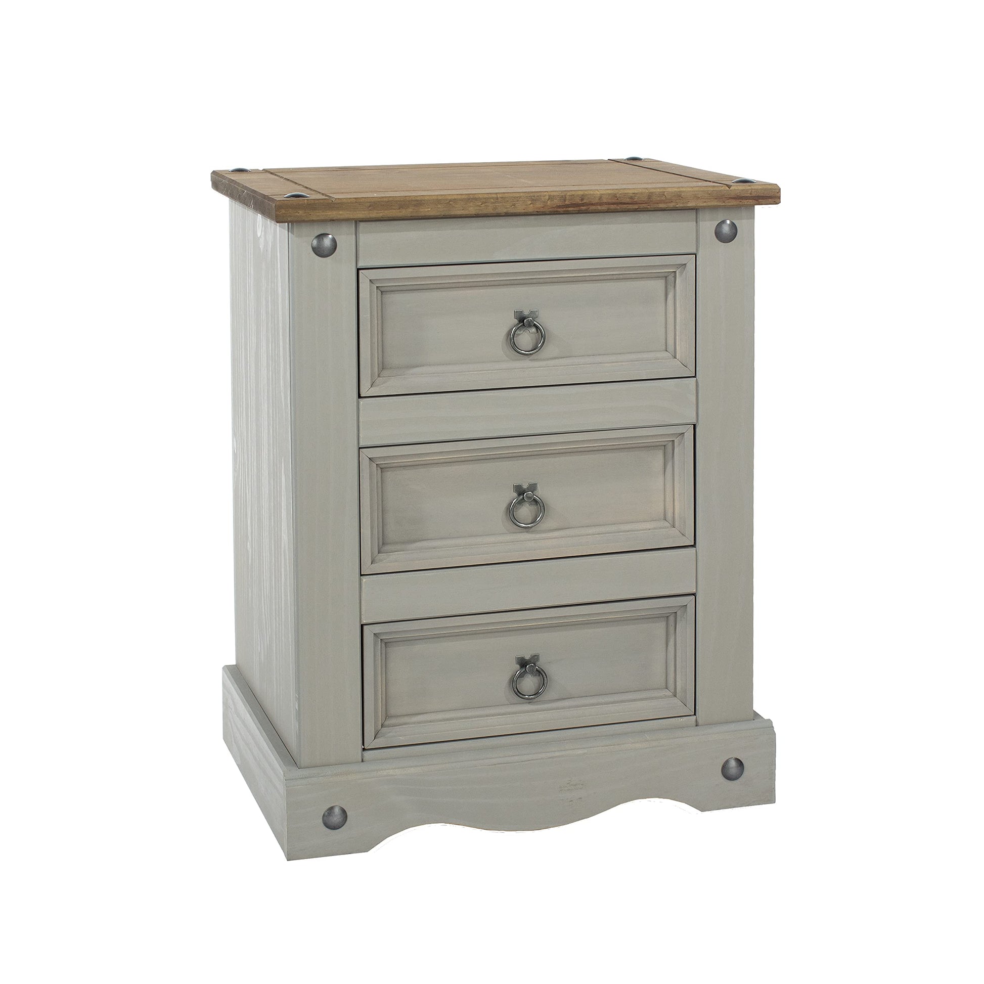 Home Source Solid Pine Wood Distressed Waxed 3 Drawer Bedside Nightstand, Grey