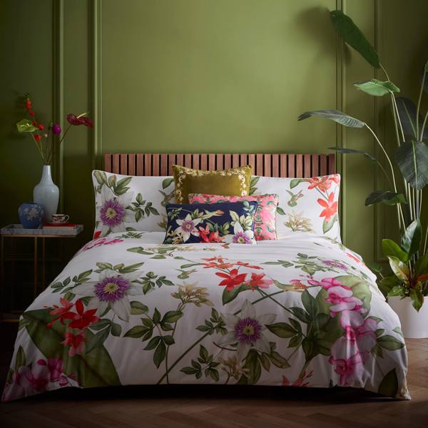 This warmly coloured scene of delicate hummingbirds and bold tropical flowers is printed on luxurious 275 thread count 100% cotton sateen. Finished with a geometric reverse and ivory piped edging. Two matching pillowcases are included. Complete the look with our velvet Hummingbird accessory cushion.