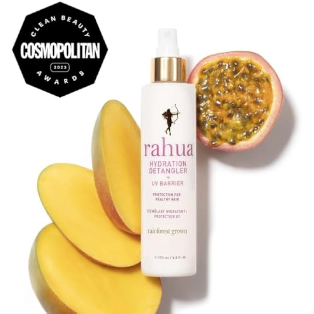 • Less than one percent of synthetic fragrances. This product is also vegan, cruelty-free, and gluten-free, and comes in recyclable packaging. What Else one Need to Know: Prime hair by misting all over to detangle and glide comb through hair. This moisturizing formula softens hair, smooths frizz, and prevents breakage. It features a tropical scent of passionfruit and mango