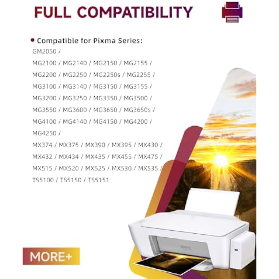• Compatible Printer: Compatible for Pixma TS5100 / TS5150 / TS5151 / MG2140 / MG2150 / MG2155 / MG2200 / MG2250 / MG2250s / MG2255 / MG3100 / MG3140 / MG3150 / MG3155 / MG3200 / MG3250 / MG3350 / MG3500 / MG3550 / MG3600 / MG3650 / MG3650s / MG4100 / MG4140 / MG4150 / MG4200 / MG4250 / MX374 / MX375 / MX390 / MX395 / MX430 / MX432 / MX434 / MX435 / MX455 / MX475 / MX515 / MX520 / MX525 / MX530 / MX535 GM2050 / MG2100 (Please Refer to the Picture 2 for Compatible Printer Models)