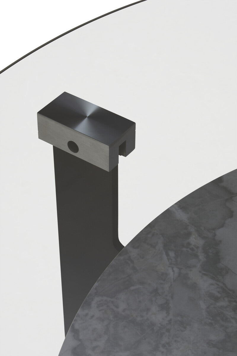 Make a confident statement in open-plan lounges with the Round Grey Glass and Ceramic Large Coffee Table. Echoing the sculptural language of its smaller counterpart, this generously scaled centrepiece combines a grey glass top with an expansive lower shelf in white marble-effect ceramic.