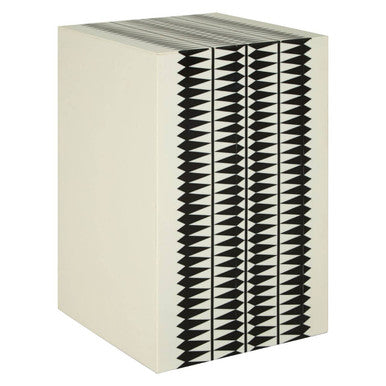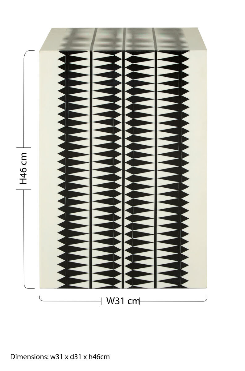 Graphic and adaptable, the Issey Black and White Resin Table and Stool by Orsina delivers a bold black geometric pattern across a cream base. Orsina's compact, multi-use form functions as a side table, extra seat, or display perch, making the black and cream resin table at home in living rooms, bedrooms, and hallways. Its smooth resin surface keeps the look fresh and contemporary.