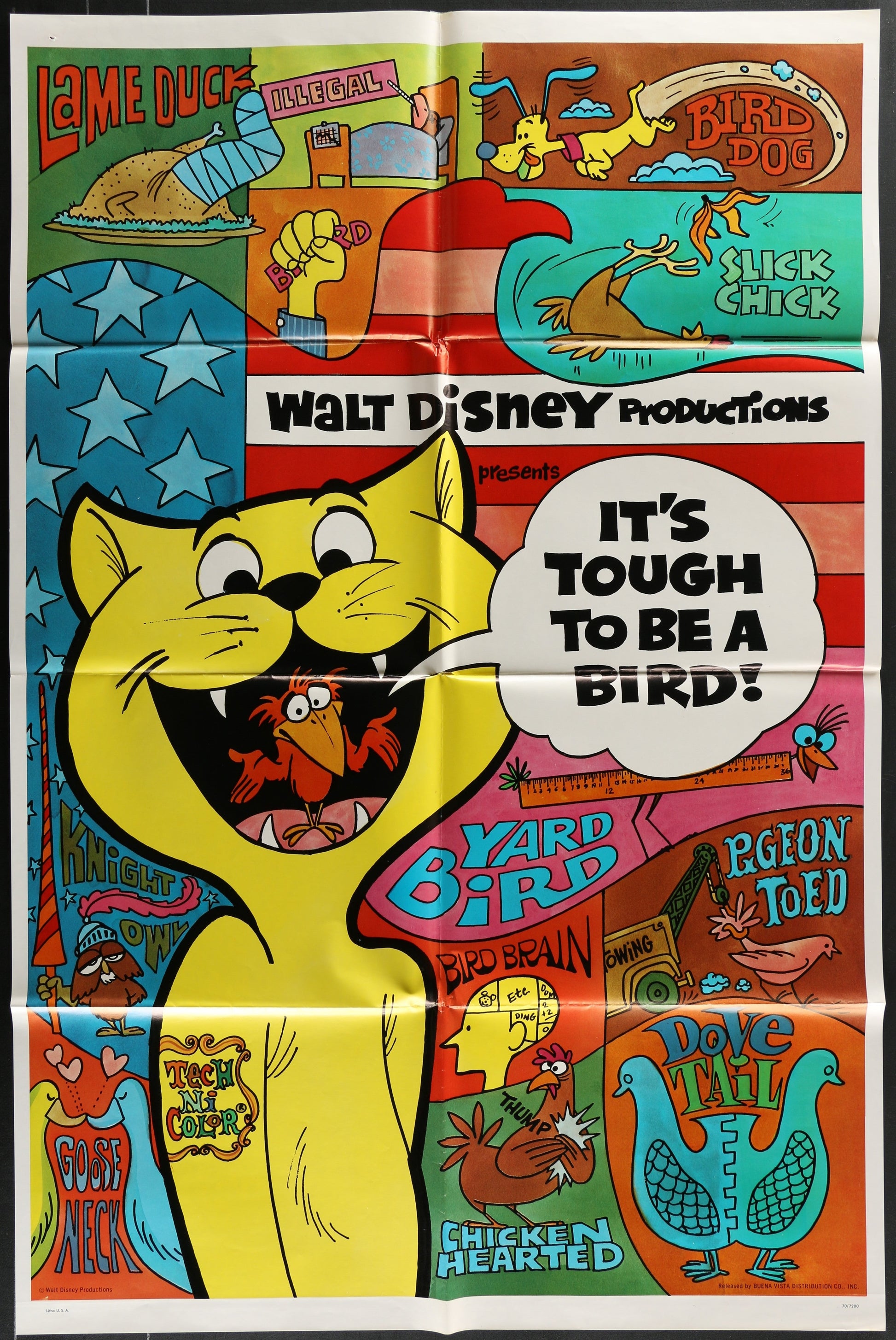 This is an original folded one-sheet movie poster measuring 27" x 41" (69 x 104 cm) for the 1970 Walt Disney animated comedy It's Tough to Be a Bird, directed by Ward Kimball, featuring the voice of Ruth Buzzi and narration by Richard Bakalyan. The poster exhibits edge and fold wear, some creasing, and pin holes.