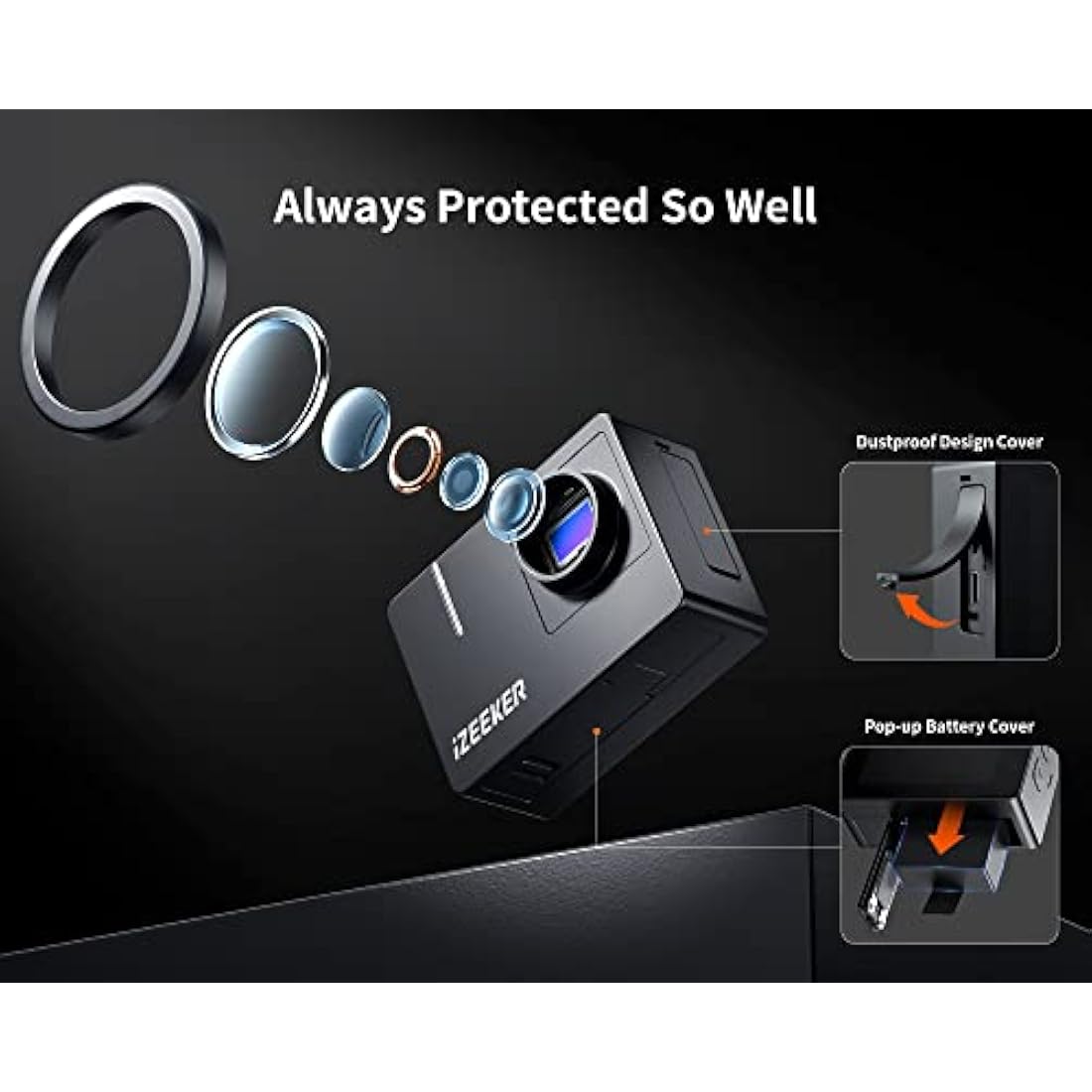 🌈【2-inch Touch Screen, Easy to Use】 The iZEEKER Action Camera iA100 comes with a 2-inch touch screen that makes it easier and faster to adjust shooting modes and shooting settings. In addition, the camera's battery cover is designed to make it easy to open while remaining secure, making it very lightweight and portable as a sports camera, so you can start shooting anytime, anywhere.