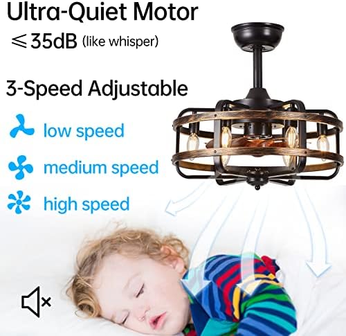 Cage ceiling fans with lights:48cm Industrial style farmhouse ceiling fan light in the shape of iron cage, can be matched with different styles of bedrooms, living rooms, kitchens and corridors to add luxurious. Comes with 2 different lengths of ceiling rods. So that you can choose the right height for your different ceiling height. Not only that, vintage bladeless ceiling fans provide strong airflow and the fan blades can be reversed for winter and summer use.