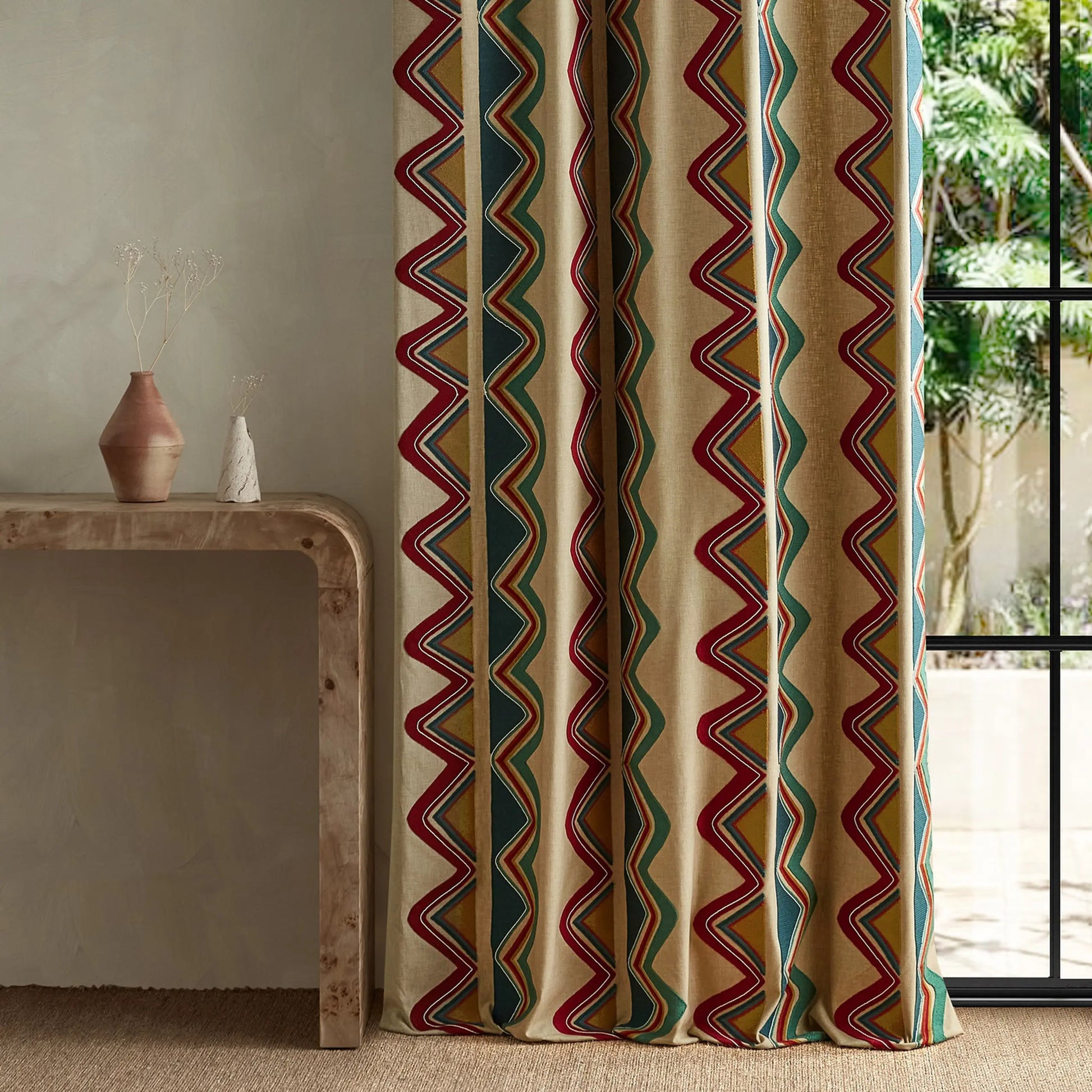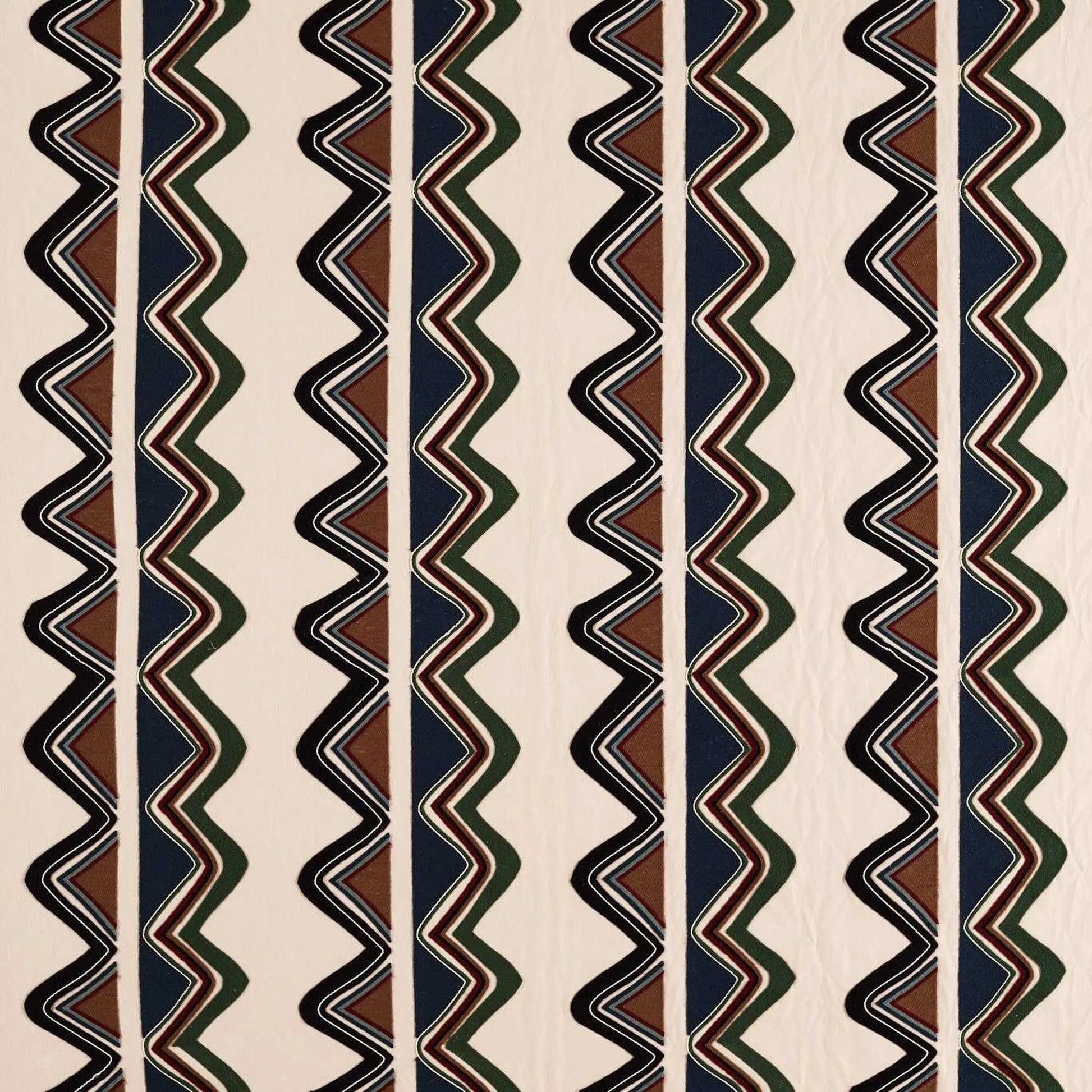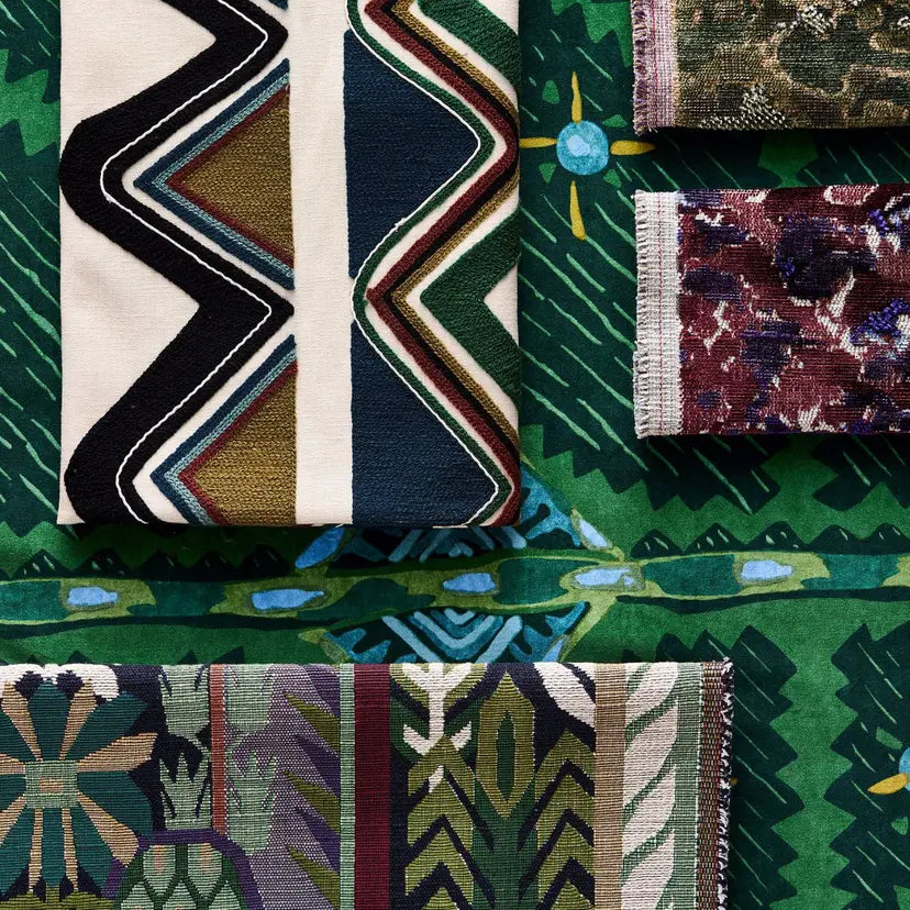 Taken from a wallpaper panel design inspired by the 20th-century Fauvism art movement, this fabric interpretation highlights three primary colours with intricate embroidery. The bold, expressive style captures the spirit of the original artwork, creating a striking visual statement for contemporary interior spaces.