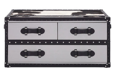 Orsina gives the living room a refined focal point with the Kensington Townhouse Black And White Genuine Cowhide Coffee Table. The Cowhide Coffee Table combines aluminium-faced drawers, leather strap handles, and reflective studs to deliver a trunk-inspired centrepiece that balances display and daily utility.