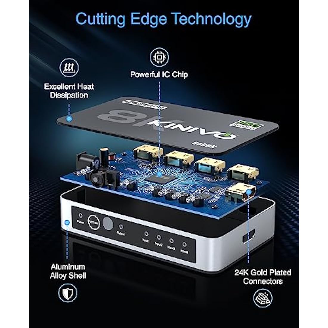 ➤8K 60Hz HDMI SWITCH: Kinivo 840BN 4 port HDMI switcher allows you to connect four HDMI devices to a single display device, helping reduce clutter from wires being fed into your HDTV. Perfect for meeting rooms, home theater, gaming & more