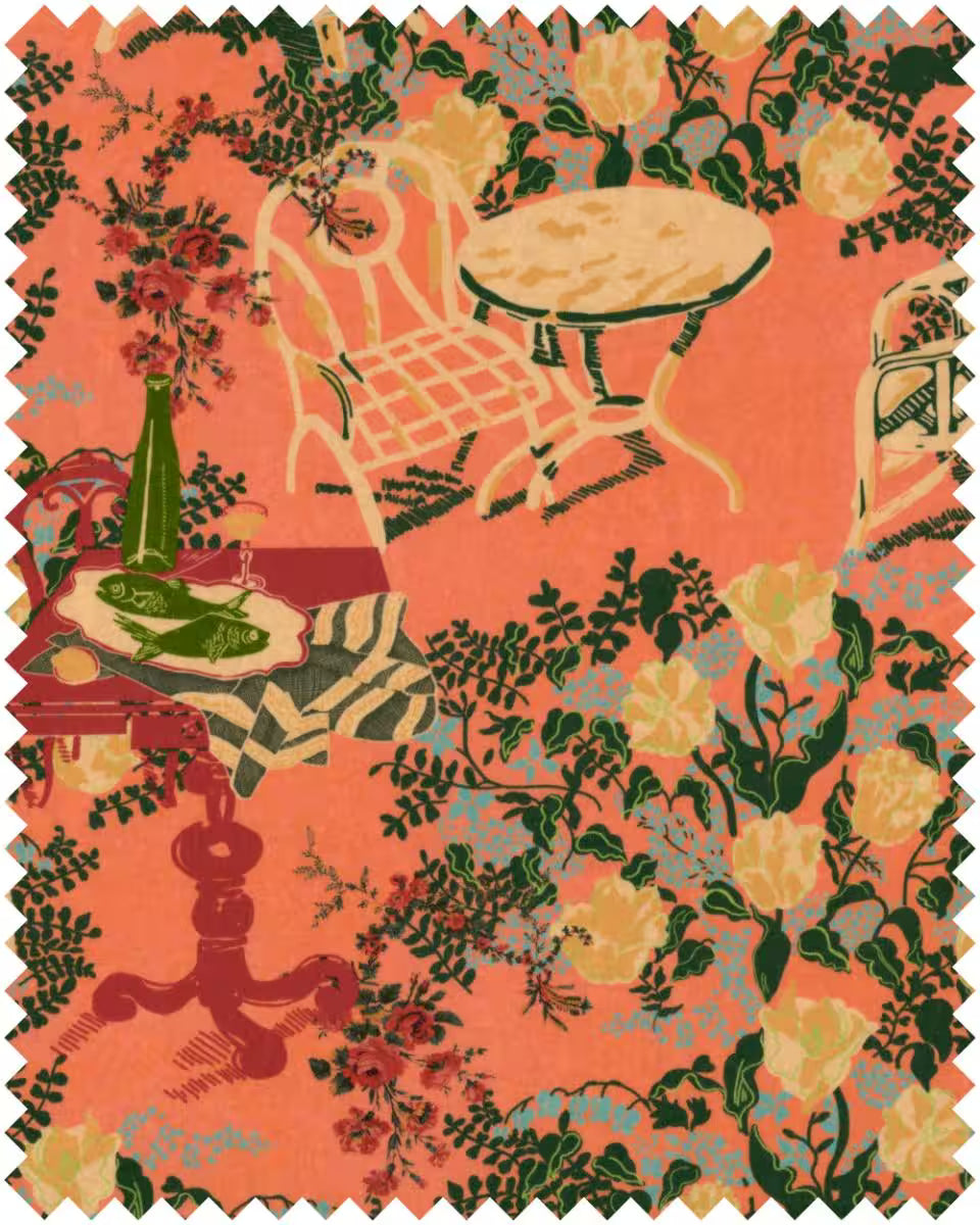 Experience the charm of a quaint Italian garden café with LA BRASSERIA. Available in two contrasting backgrounds — Fern and Salmon — this heavy velvet fabric captures the essence of rustic elegance, evoking the allure of dappled sunlight and lush foliage. From the graceful unfurling of floral blooms to the evocative portrayal of balmy summer nights, an Italian dining affair is portrayed, with its lively essence and zestful ambiance. Ideal for adorning upholstery, draperies, window treatments, and plush accents, this design imbues any interior with sophistication, featuring delicate motifs inspired by the tranquility of a Mediterranean retreat.