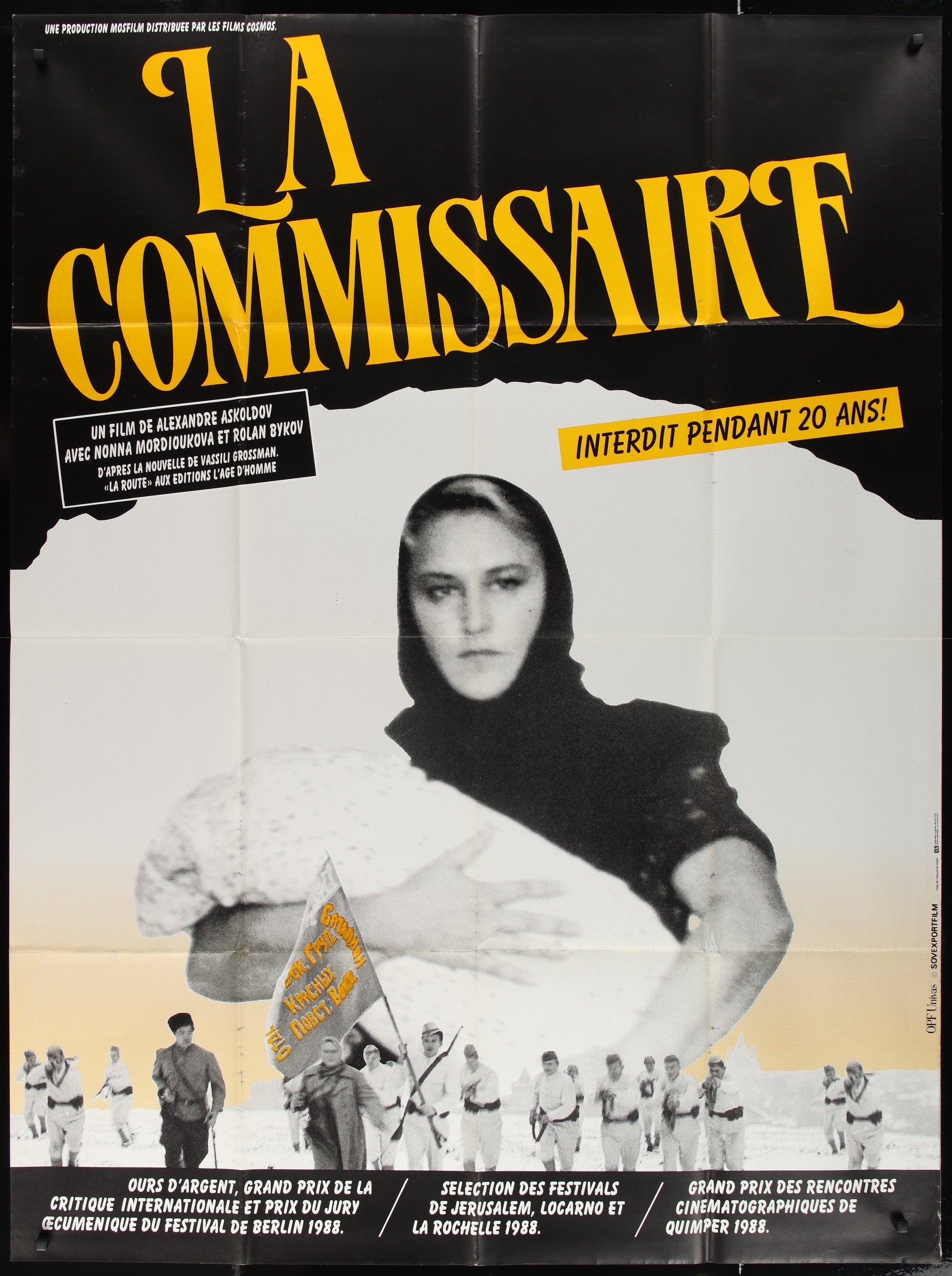 This La Commissaire (1988 RR) Original French Grande Movie Poster is an authentic piece measuring 47" x 63" approx. It features the 1967 Aleksandr Askoldov war drama "Komissar", starring Nonna Mordyukova and Rolan Bykov. The poster is folded and has wear on the edges and folds, with a tear on the top left that has been taped on the reverse. It also has some markings.