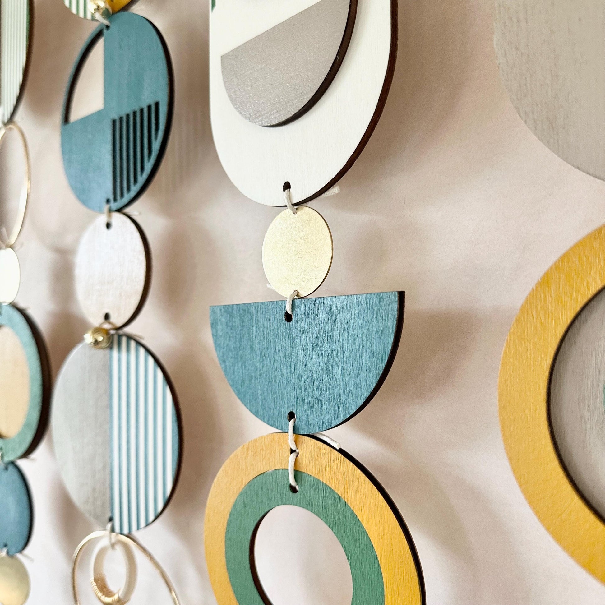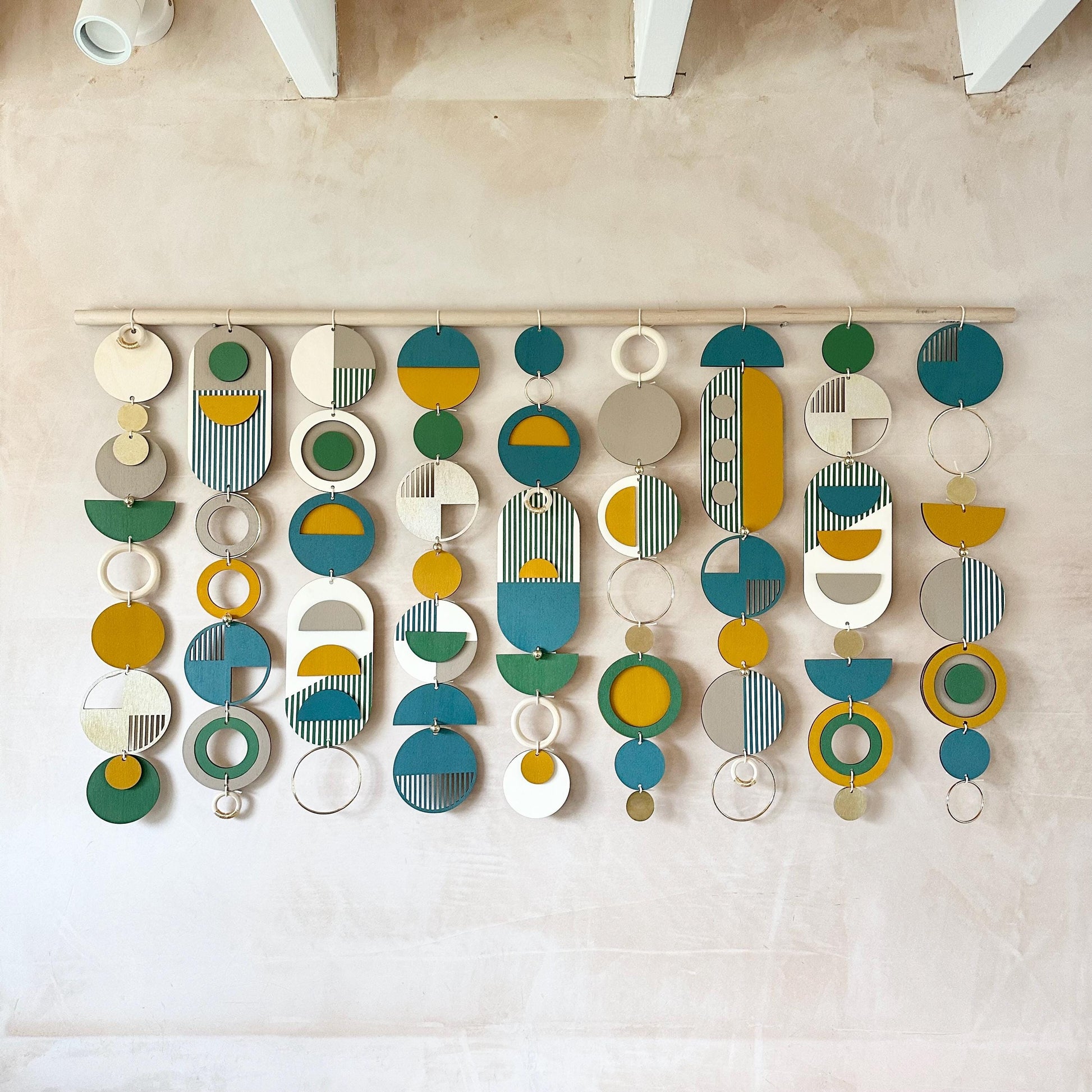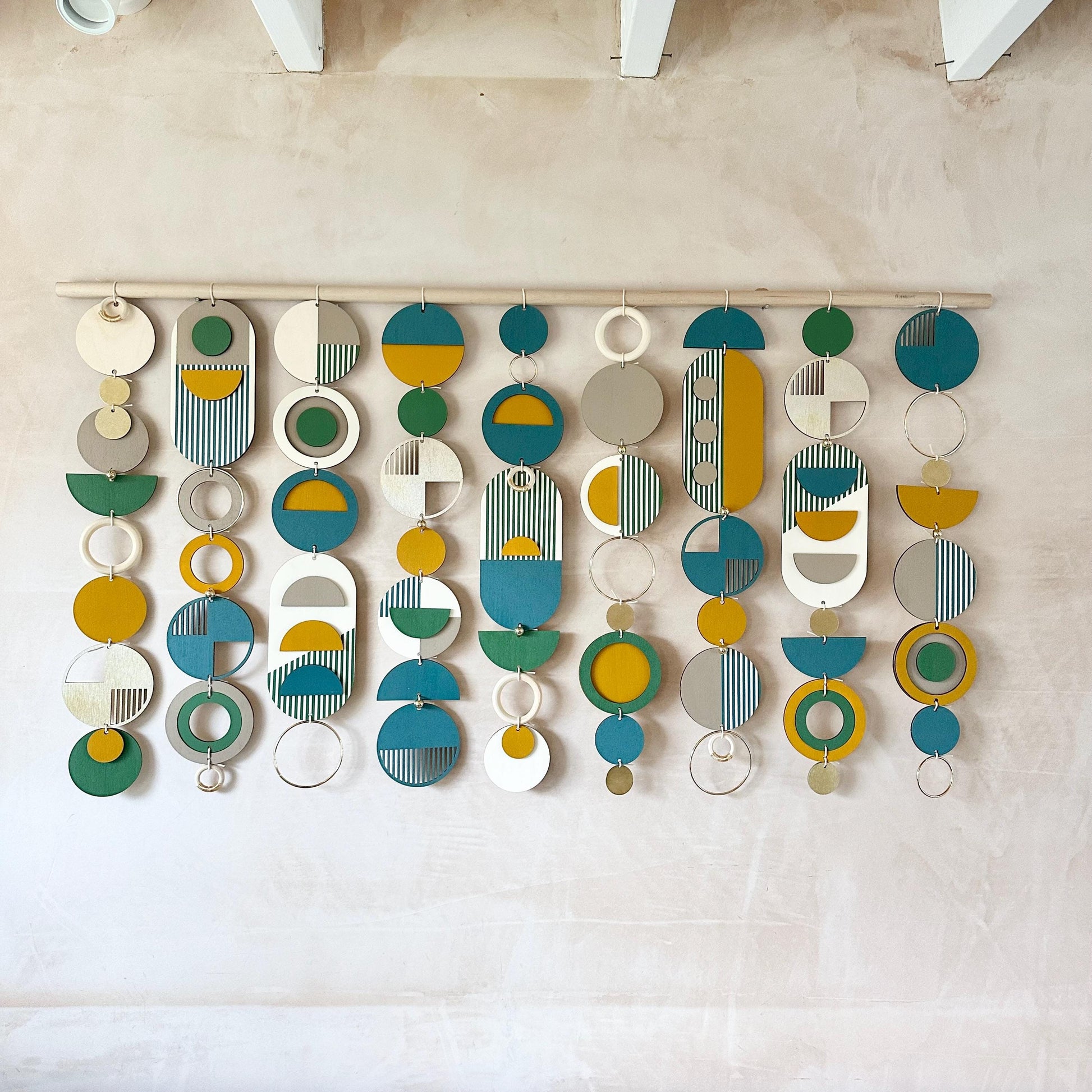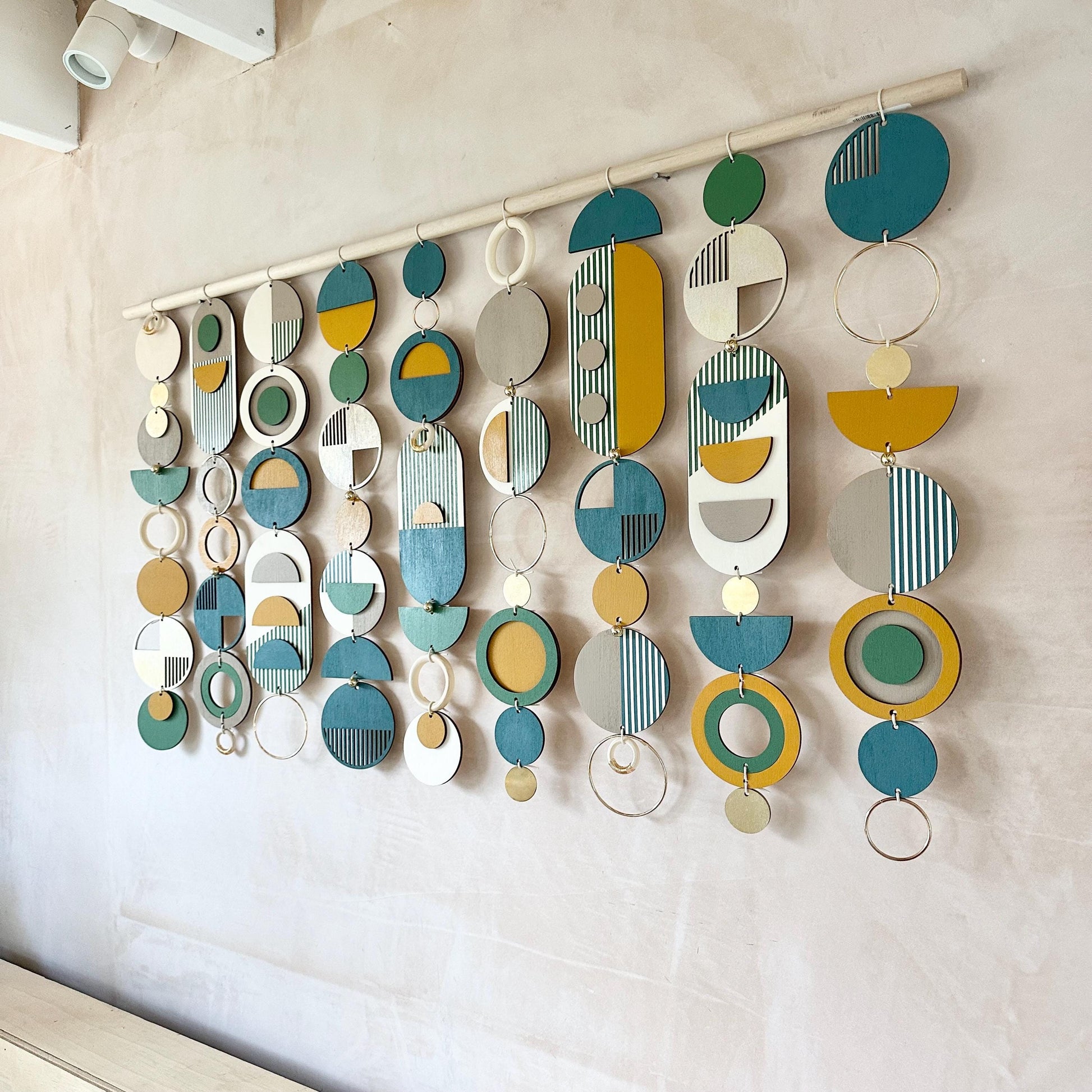 This large wall art with its unique geometric patterns will add an eclectic finish to an empty wall. It would look great over a bed as part of your bedroom decor or a sofa as part of your living room wall decor. Made from geometric wood shapes, metal beads, discs and hoops. This wood wall sculpture is handmade and painted in the UK.