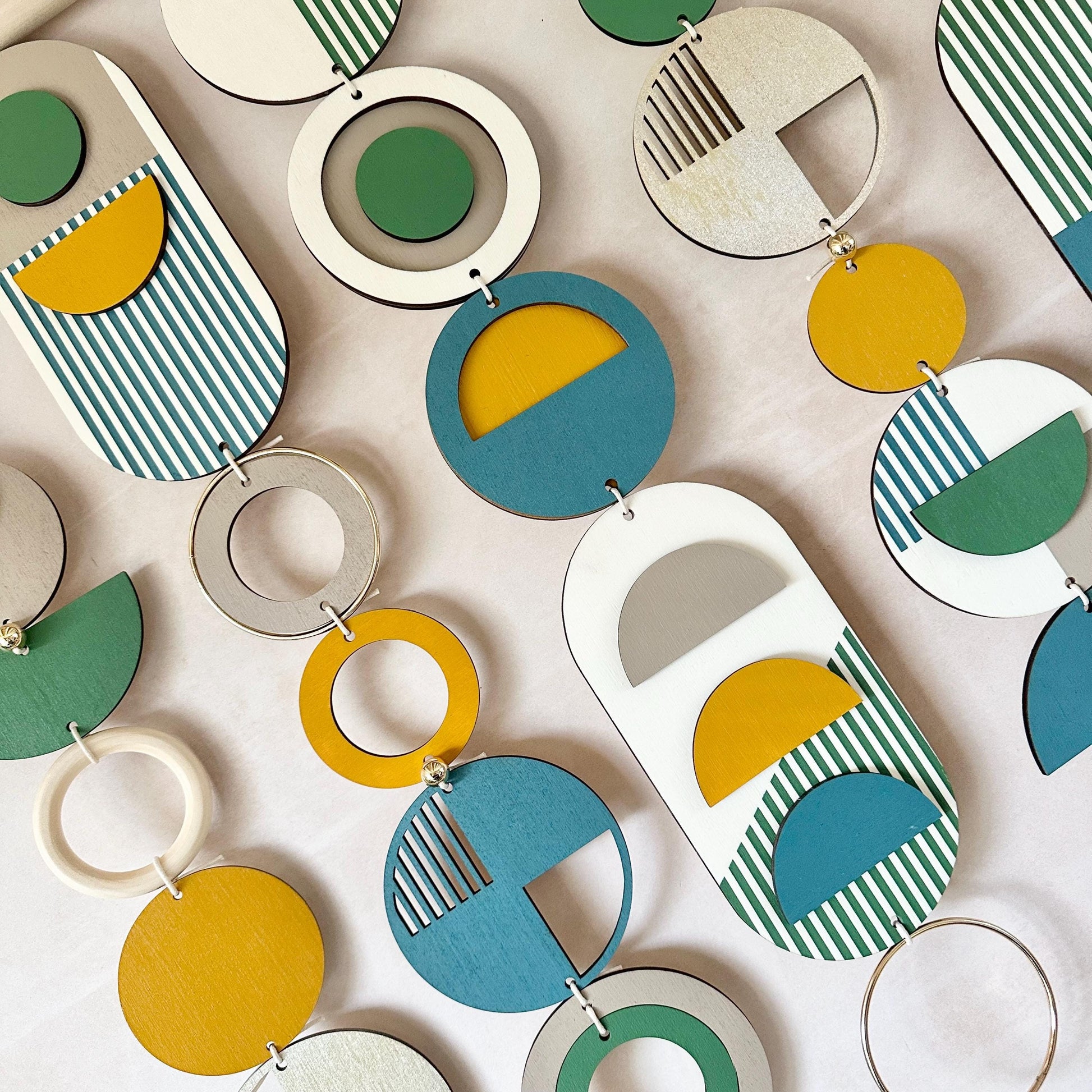 • Each plywood piece is painted in a beautiful deep colour palette of blues, greens, yellows, oranges and beige. Some parts are unpainted.