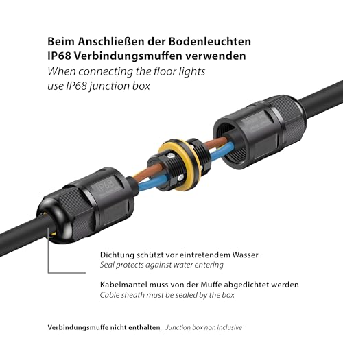 [IP67 protection rating] - The in-ground light is the perfect solution for your outdoor lighting. The robust plastic housing protects the LED paving stone from temporary immersion in water and is completely dustproof. This means that it is optimally protected against the effects of the weather in different seasons. Please note that the connection cable must be connected to an IP68 connection sleeve to ensure tightness.