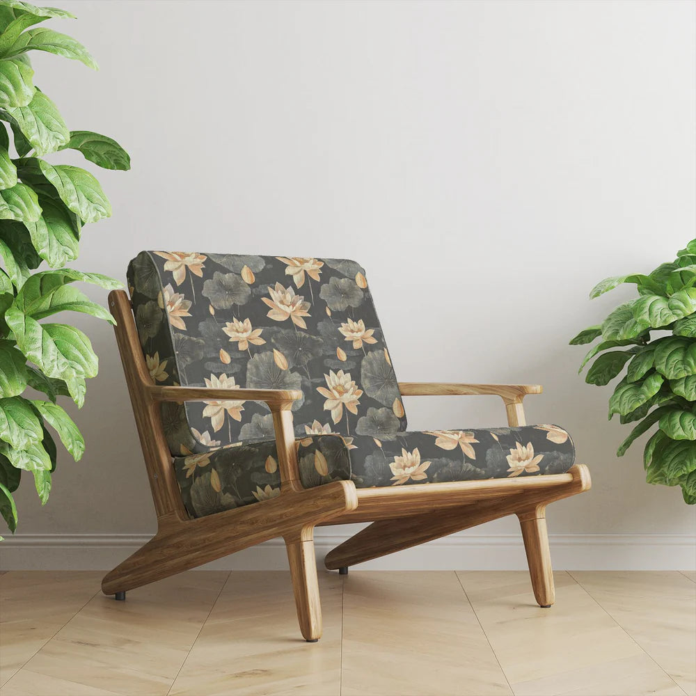 A dramatic twist on the classic lotus motif, Lotus No.6 combines a deep charcoal-black background with painterly peach, ochre, and chalky grey tones. This statement-making upholstery fabric reimagines floral design with a contemporary edge, offering both vintage elegance and bold modernism.