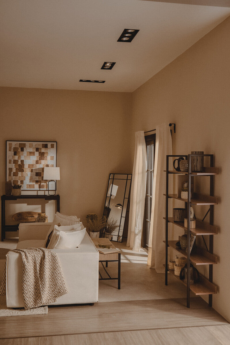 This table lamp has a sleek black metal stand supported with a solid matching base. The stand has a slim outline that gives the appearance of a hollow rectangle and the natural fabric shade complements the slim body and base.