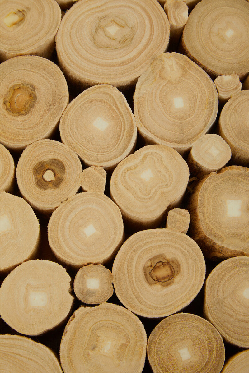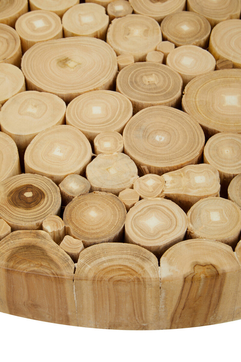 The circular top is composed of interlinked teakwood cutouts that form a tactile mosaic. Every piece brings organic variation in grain and tone, creating a one-of-a-kind pattern. A sturdy iron frame in black provides a sleek counterpoint, letting the natural teak and black combination shine in both airy lofts and cosy living nooks.