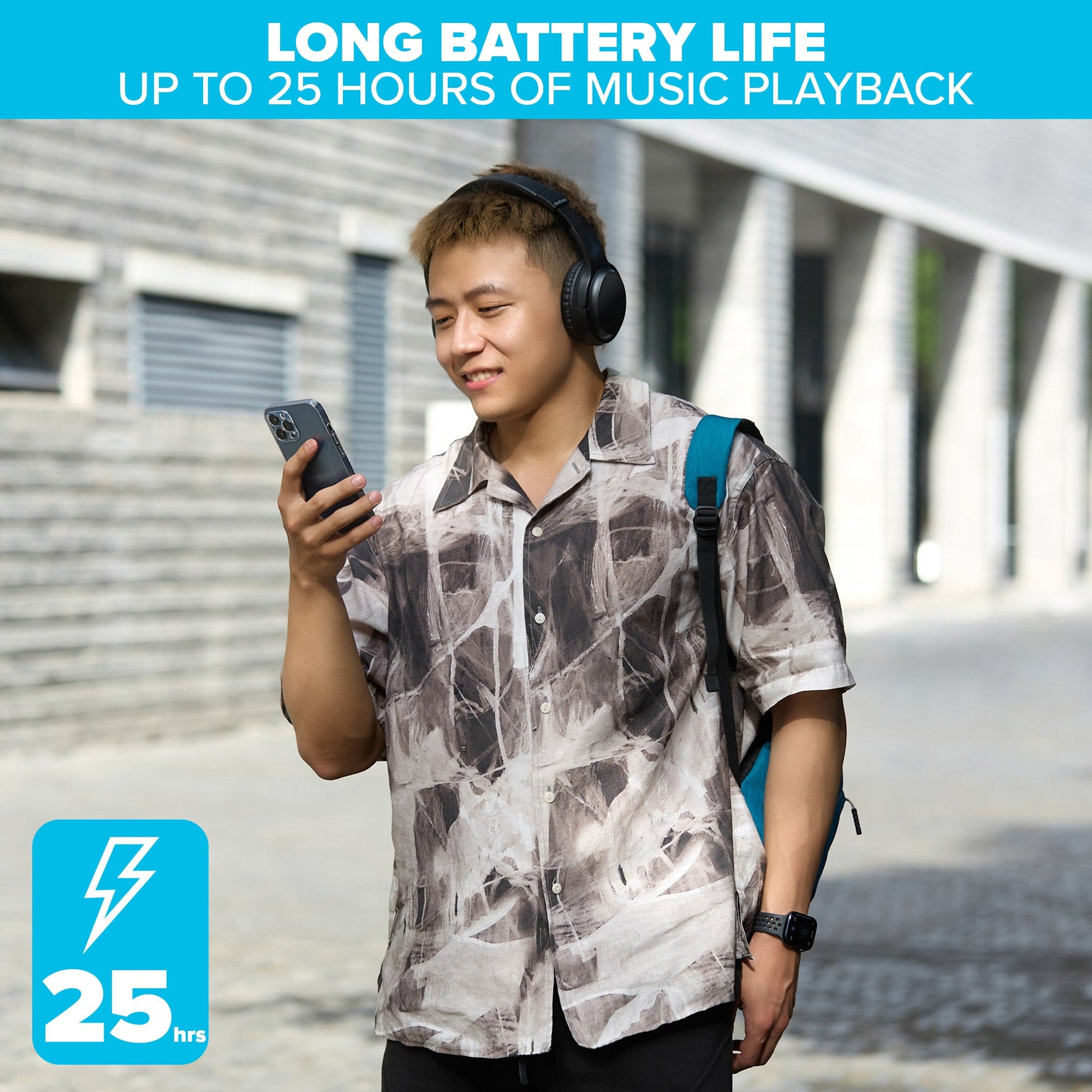 The built in, rechargeable 250mAh battery is good for about 25 hours of music playback and can be re-charged in just 3 hours via the included USB-C - USB-A cable.