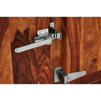 Reflective metal hinges and locks contrast the rich natural grain, adding a quiet industrial note that suits dining rooms and living rooms.