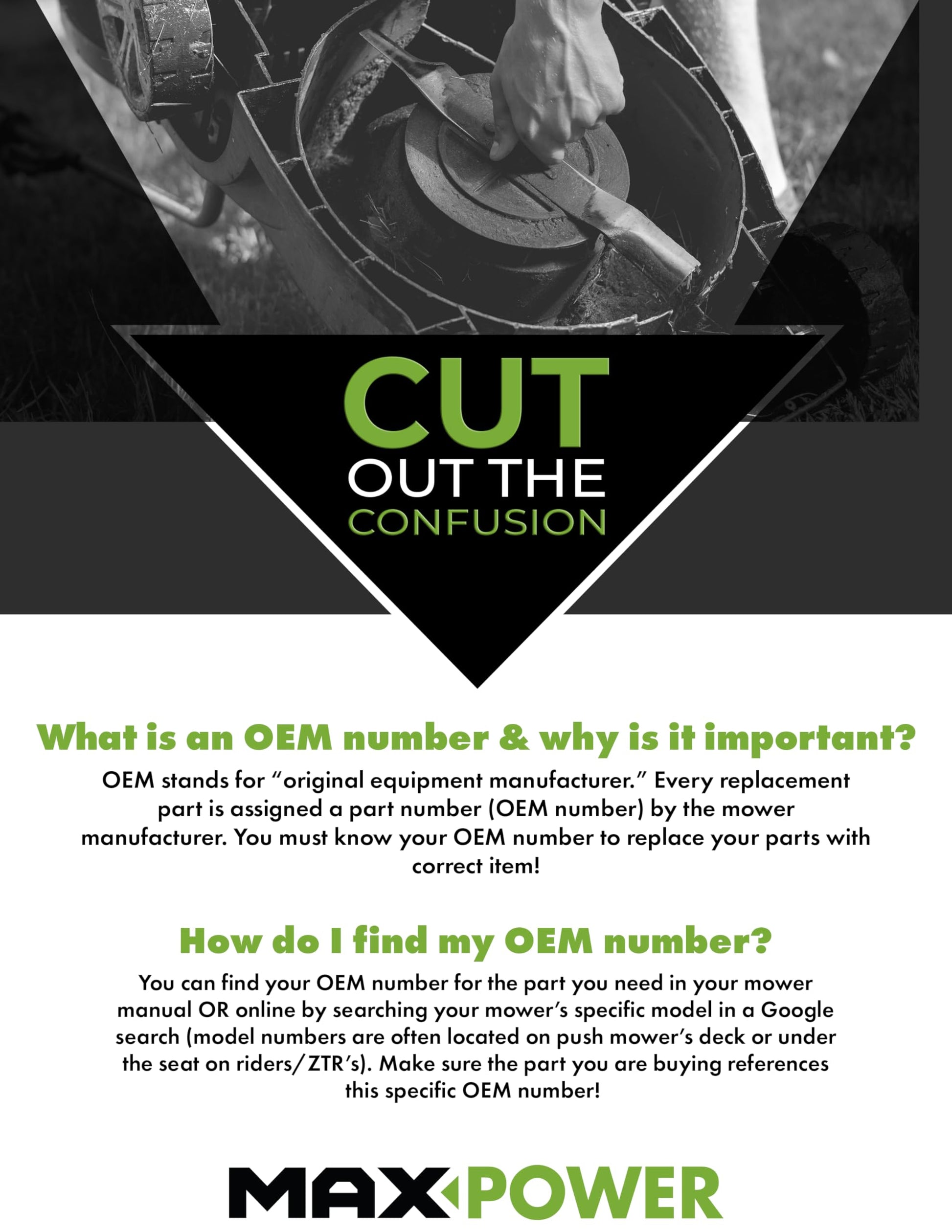 MaxPower's 561545B includes 3 blades for many 50 in. cut MTD, Cub Cadet, Troy-Bilt mowers. These blades replaces OEM #: MTD, Cub Cadet, Troy-Bilt 742-04053A, 742-04053B, 742-04053C, 742-04056, 742-04056A, 742-04056B, 742-04056C, 942-04053A, 942-04053B, 942-04053C, 942-04056, 942-04056A, 942-04056C; Toro 112-0316 and Windsor 50-2138. Each blade measures 17-29/32 in. L and 2-1/2 in. W with a 6 point star center hole. If a shorter blade option is needed for 50†cut RZT models, please see MaxPower 561558B. Check your owner's manual to verify that the OEM number of the blade being replaced matches one of the OEM numbers provided for this item. MaxPower blades are proudly manufactured in the USA to meet or exceed OEM specifications.