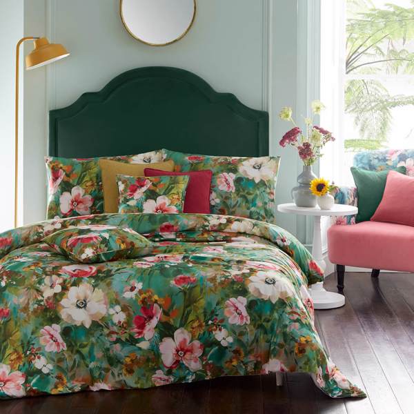 In a fresh, uplifting colourway, an elegant bouquet of painterly flowers layers across this 100% cotton duvet set with a plain reverse