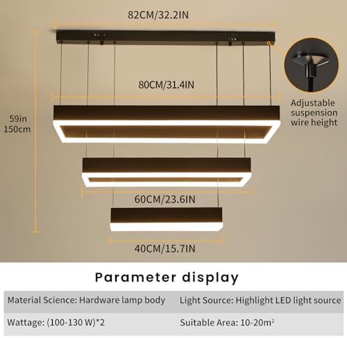 Modern 3 Rectangle Pendant Light: Height adjustable pendant lights for dining room, 3 ring rectangle chandelier is simply, a futurist or minimalist decor of your home. The black LED chandelier is made of sturdy metal. Integrated LED lines its interior illuminating a space with a balance of brightness and warmth. It has a minimum lifespan of 50,000 hours so you can appreciate its glow for years.