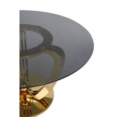 Beneath, a brushed gold stainless steel frame unfolds from a single base into graceful curves that provide excellent stability without visual bulk.