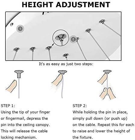 ADJUSTABLE LEIGHT: This chandeliers is outfitted with easly to use locking pins which allow you to change the height of the fixture at any time after the fixture has been install. This not only makes installation a breeze, but allows you to get creative. Raise or lower just one side, or find that perfect height for your room.