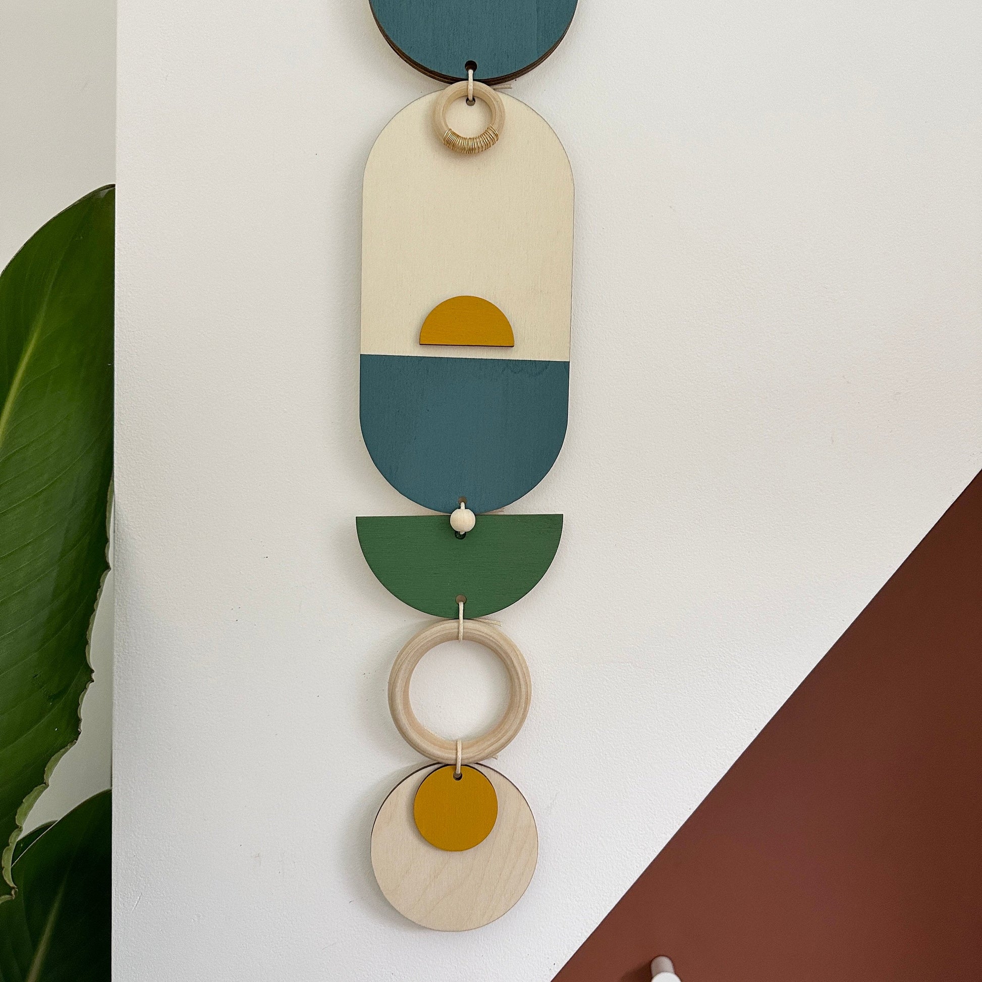 Lovingly handmade modern wall art. This Piece is made from plywood, paint, metal, ceramics, waxed cord and wooden beads. The colours used are a green, blue, mustard, grey/beige and gold. This slim wall hanging would make a beautiful addition to any room to create a modern mid-century feel. Made from sustainable plywood, hand painted and constructed in Milton Keynes, England.