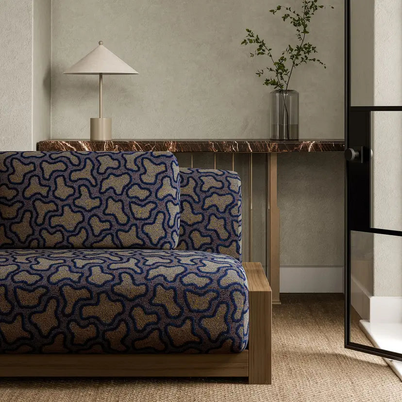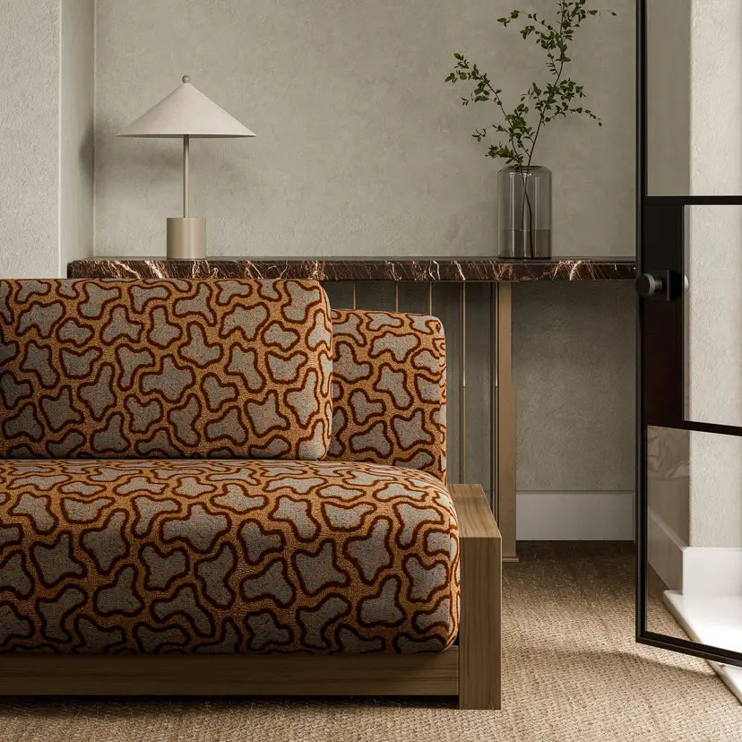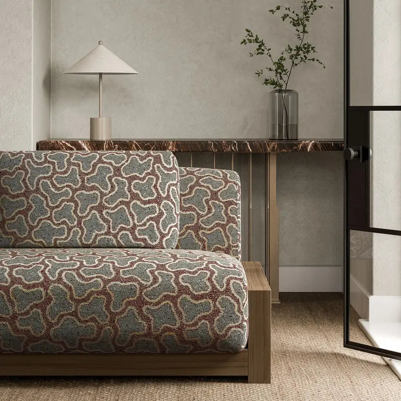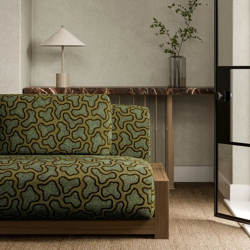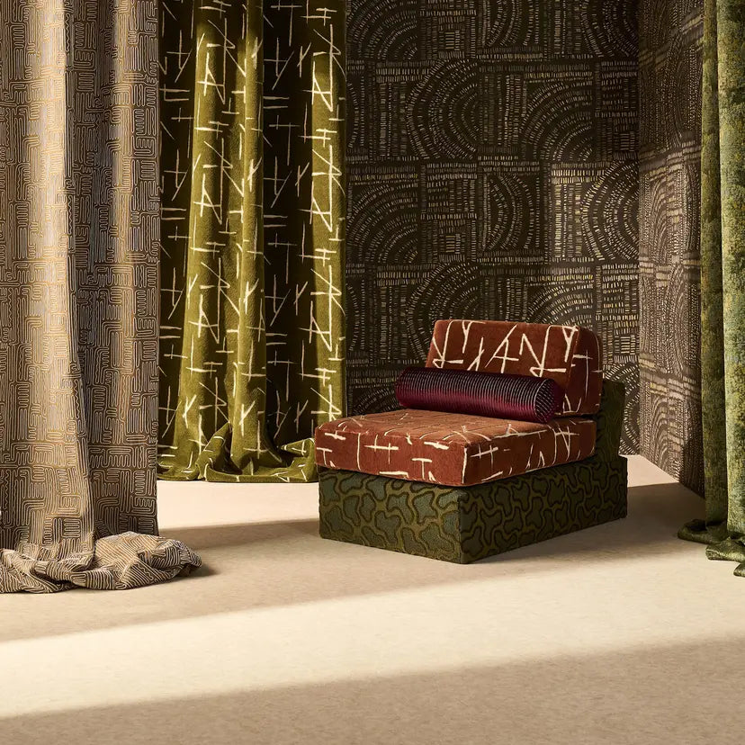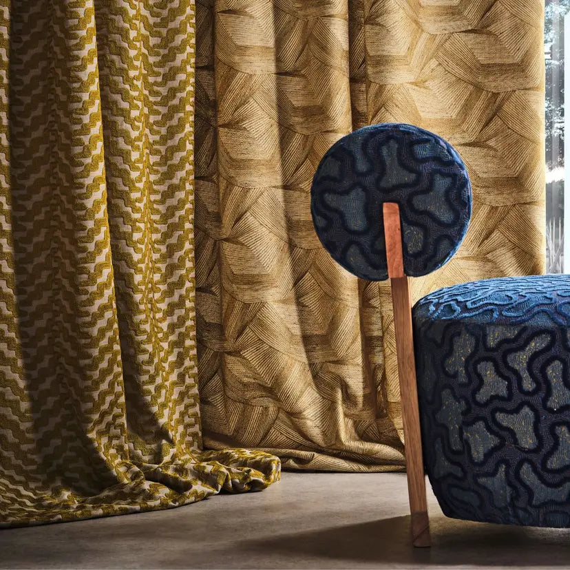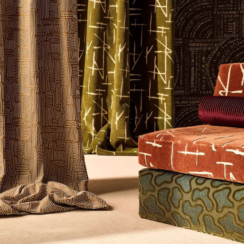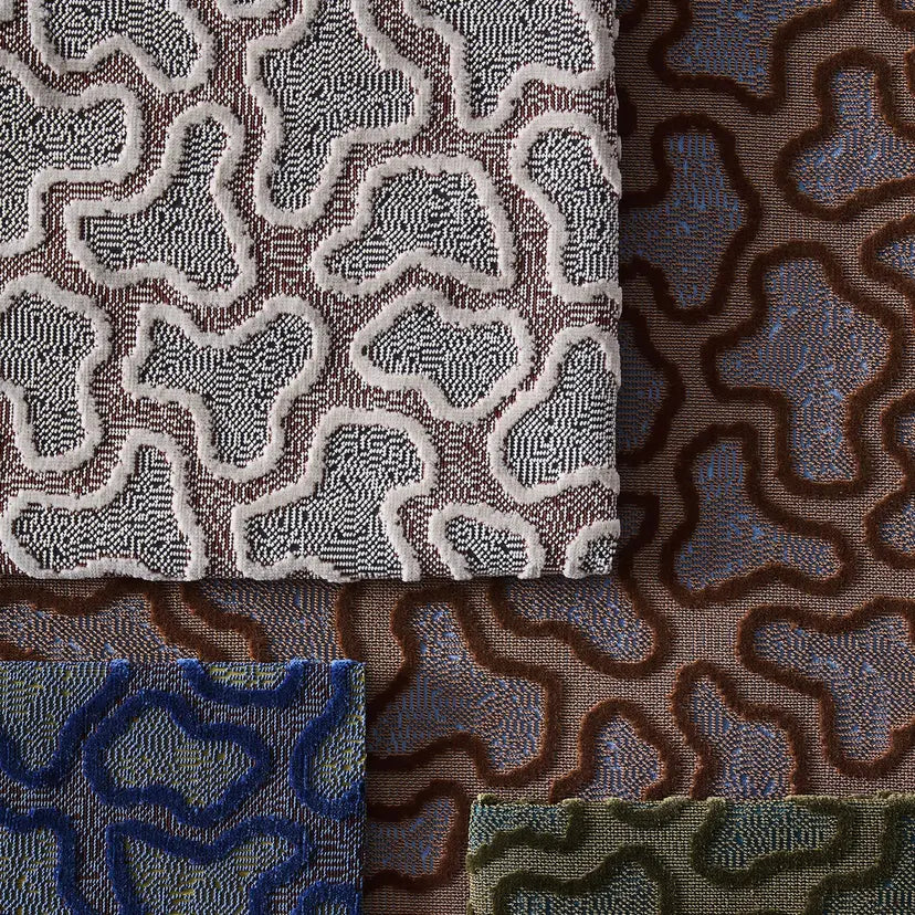 An épinglé velvet, Molten is named after its pattern that echoes the form of lava, pooling out of the volcano. An array of gemstones inspires the colour palette for this 100,000-rub velvet, resulting in a very special fabric.