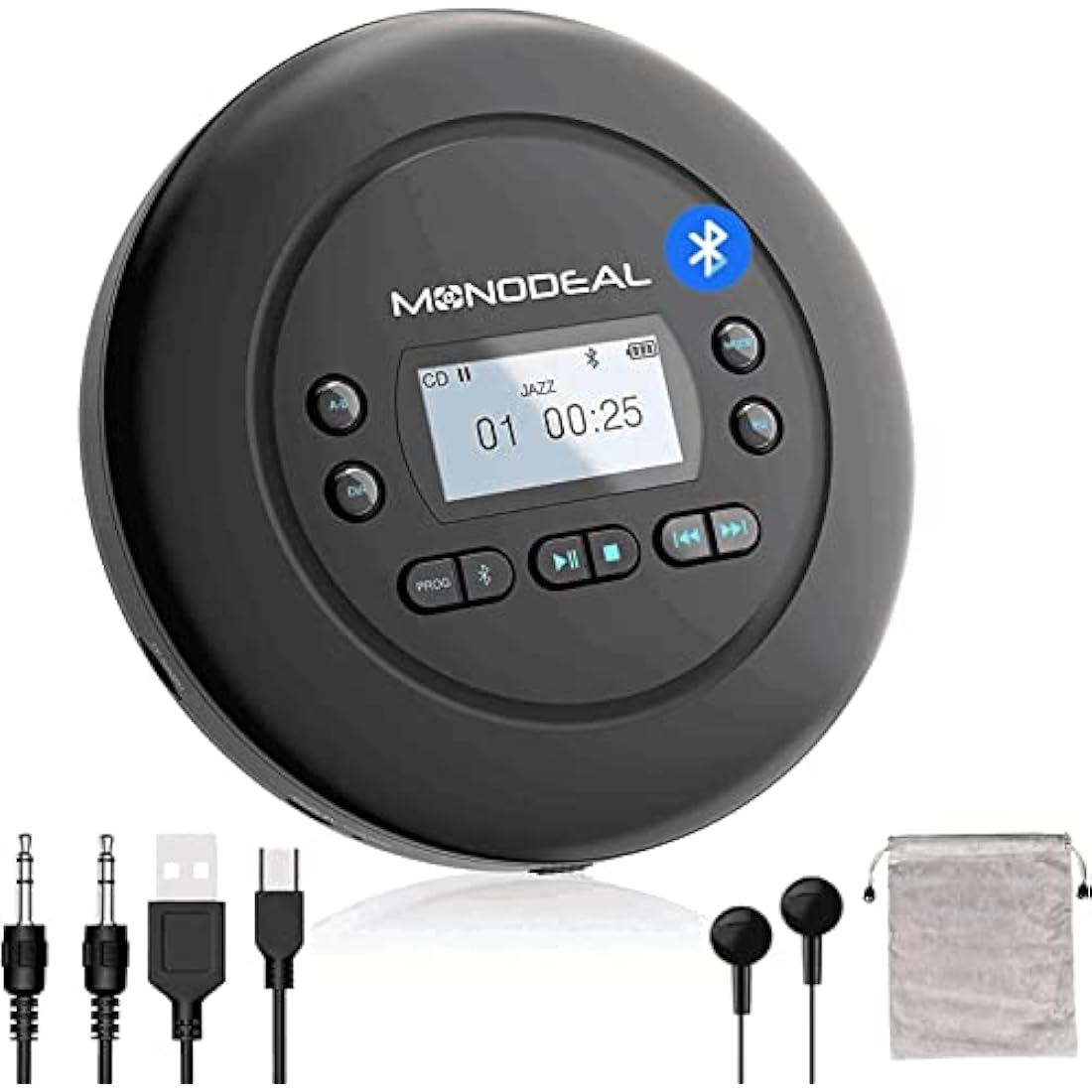 CD Player with Bluetooth: This personal cd player can work with Bluetooth earphones or Bluetooth speakers. Bluetooth 5.0 supports up to 20ft of transmission. It also has dual headphones jacks to use with wired headphones. A great cd player for home/travel use!