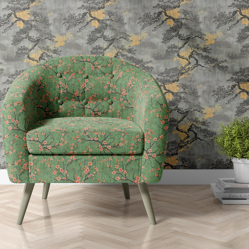 Mori No.6 is a celebration of painterly beauty and Japanese influence, featuring coral blossom sprays set against a rich jade green background. This upholstery fabric exudes optimism, artistry, and a love of botanical detail. Its elegant branchwork and natural flow create a striking visual rhythm that works beautifully on statement chairs, headboards, or window seats.