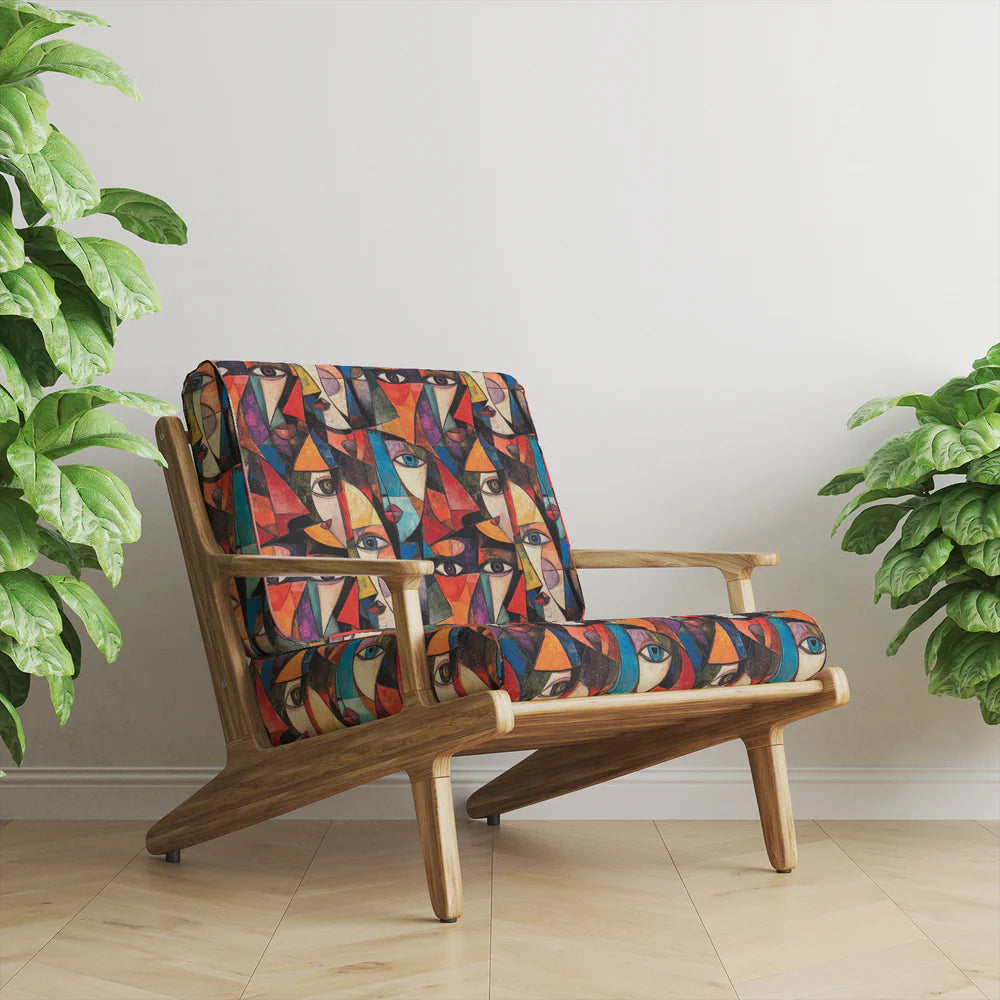 Mougin No.11 Upholstery Fabric is a bold, artistic statement steeped in the spirit of Picasso’s time in Mougins. Layered with fragmented facial features, angular lines, and painterly brushstrokes, this multicoloured design evokes the spontaneity and freedom of Cubism and mid-century modern art.
