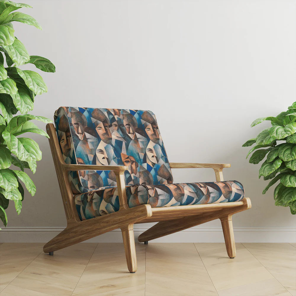 A richly toned abstract design, Mougin No.23 Upholstery Fabric draws directly from the earthy cubism of Picasso’s Mougins years. Layered with stylised faces, angular silhouettes, and shadowed planes, it evokes the quiet introspection of studio portraits. A palette of denim blue, terracotta, sand and slate grey provides warmth and grounded sophistication.