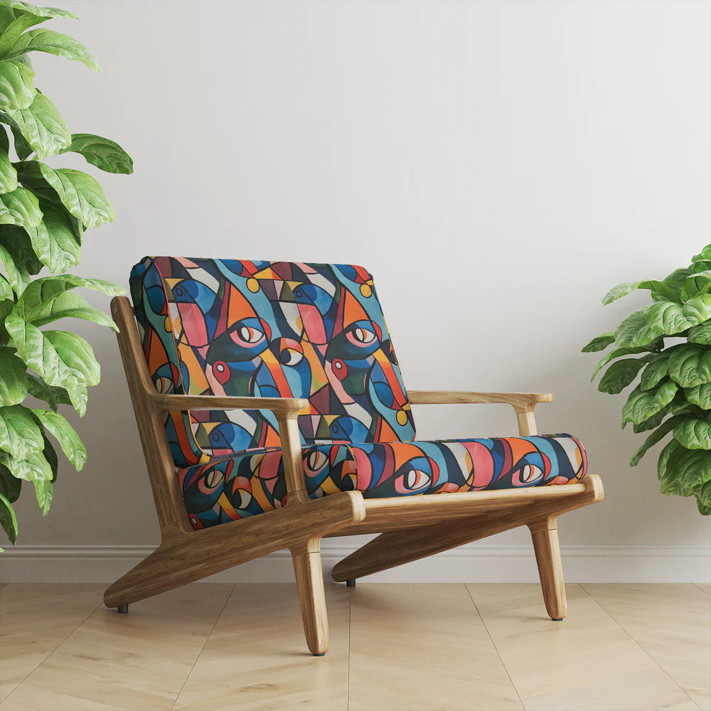 Mougin No.7 Upholstery Fabric is a bold exploration of form, colour and expression, directly inspired by Pablo Picasso’s later works created in his Mougins home. This abstract face design fuses overlapping shapes in vibrant reds, coral, yellow, blue and green, creating a hypnotic pattern rich with emotional energy and painterly rhythm.
