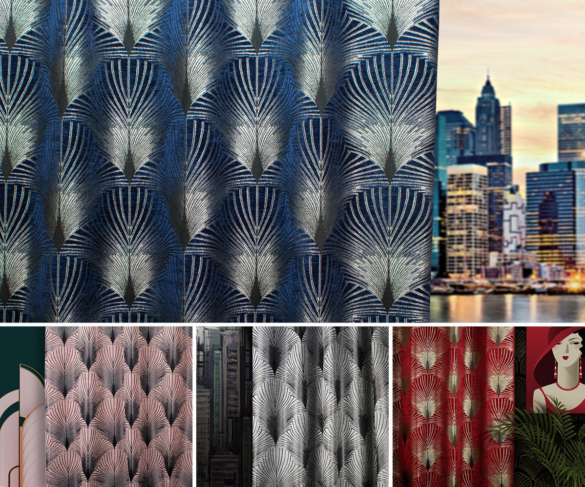 New York is a geometric, art deco chenille suitable for curtains, accessories and upholstery. Available in 21 colours