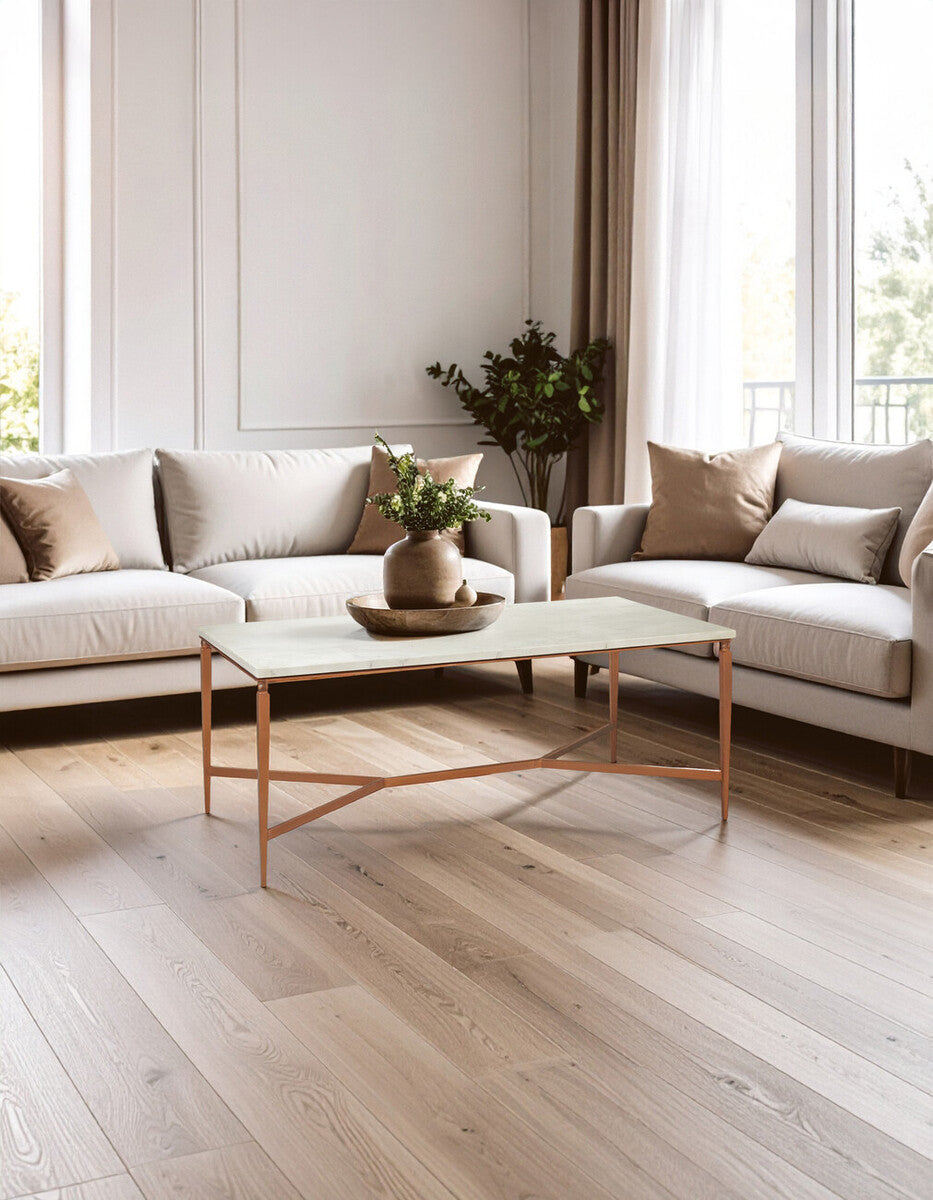 Orsina balances warmth and clarity with the Nirav White Marble Top Coffee Table. The Nirav White Marble Top Coffee Table pairs a clean white rectangular slab with copper-finished iron legs, creating a centrepiece that feels bright yet inviting.