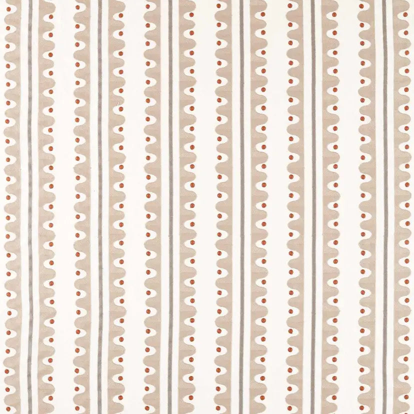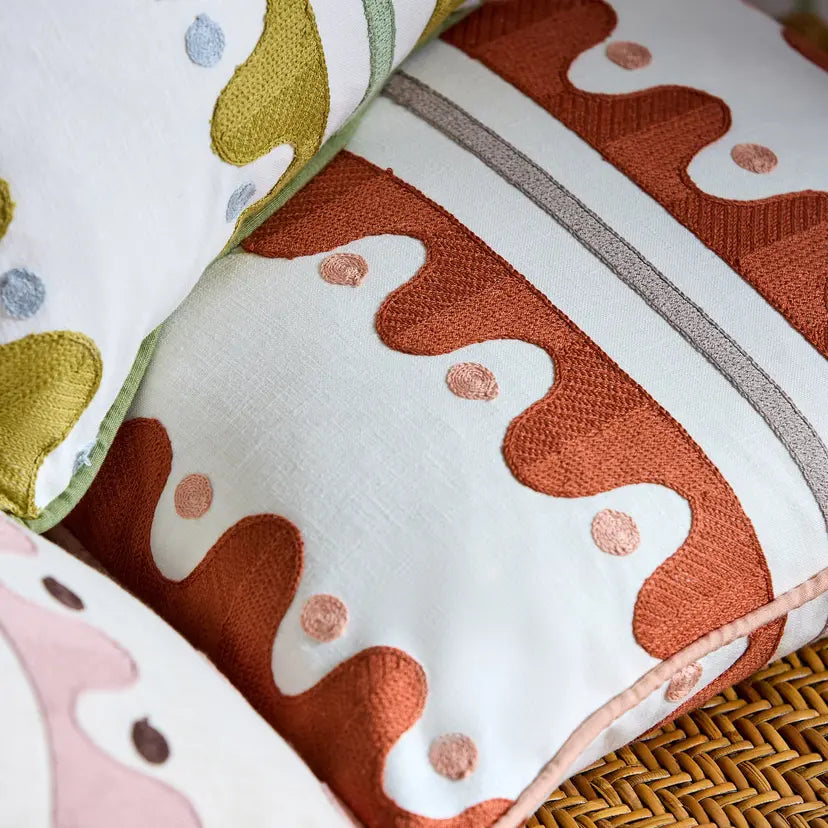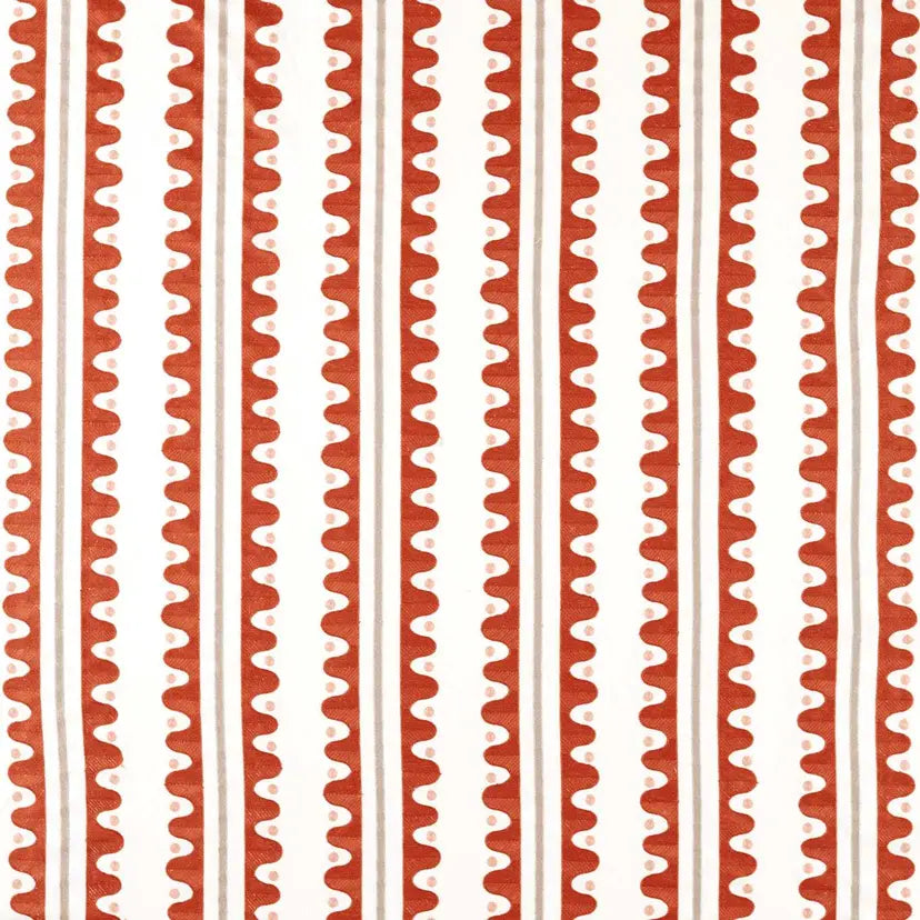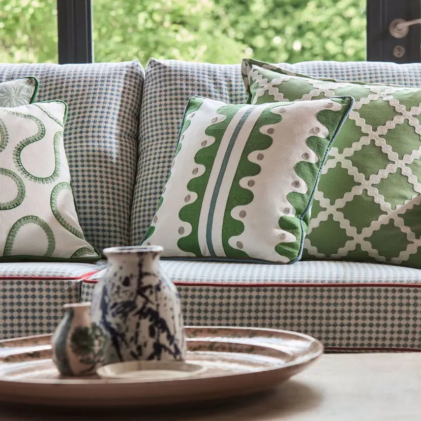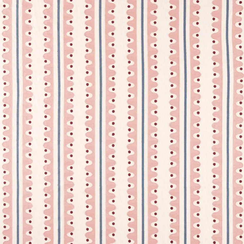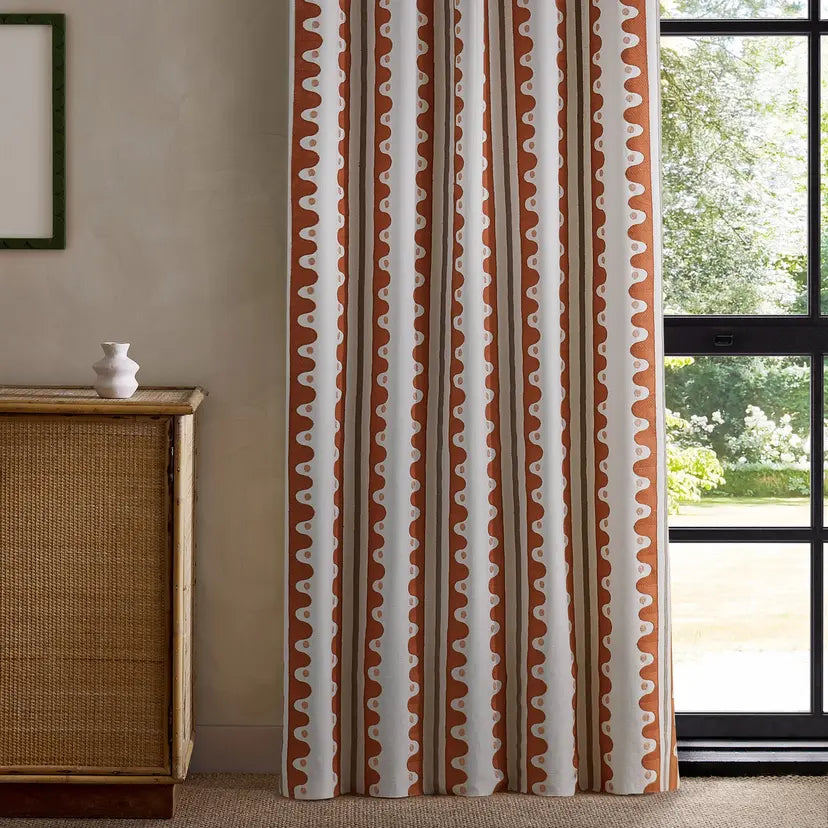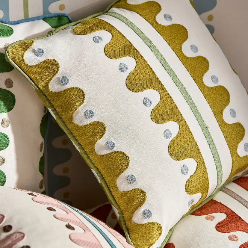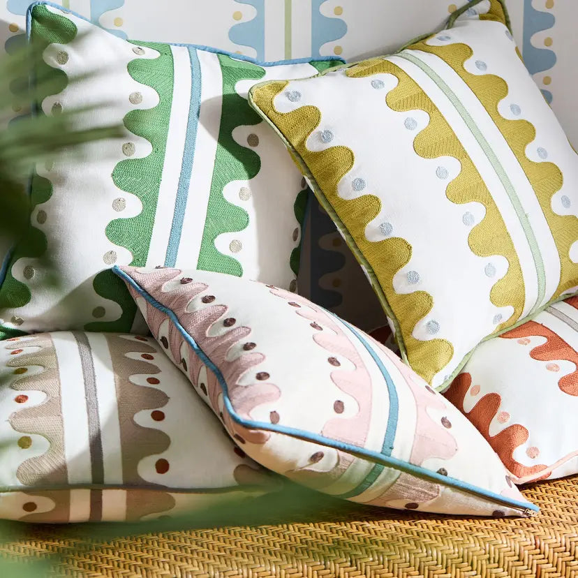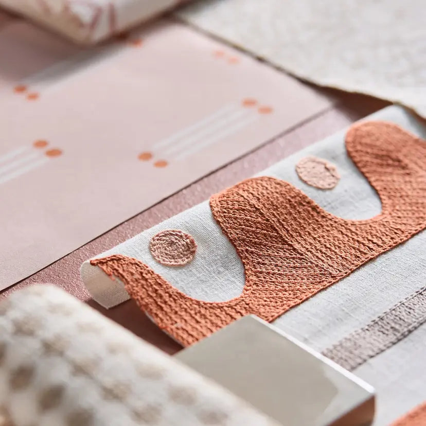 A nod to the area local to Scion’s design studio, Oakham strolls along the river edge. Imagine stepping stones and riverbanks as you make your way along. This large-scale stripe comes to life as a crewel work, feeling handcrafted and adding a lovely texture to the drapery. Vivid colours in the stitchwork add to the contemporary edge of the design.