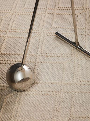 The polished stainless steel legs feature a distinctive ball and bar profile that arcs upward to meet through the tabletop, forming a graceful semi-circle focal point that guests will notice the moment they enter.